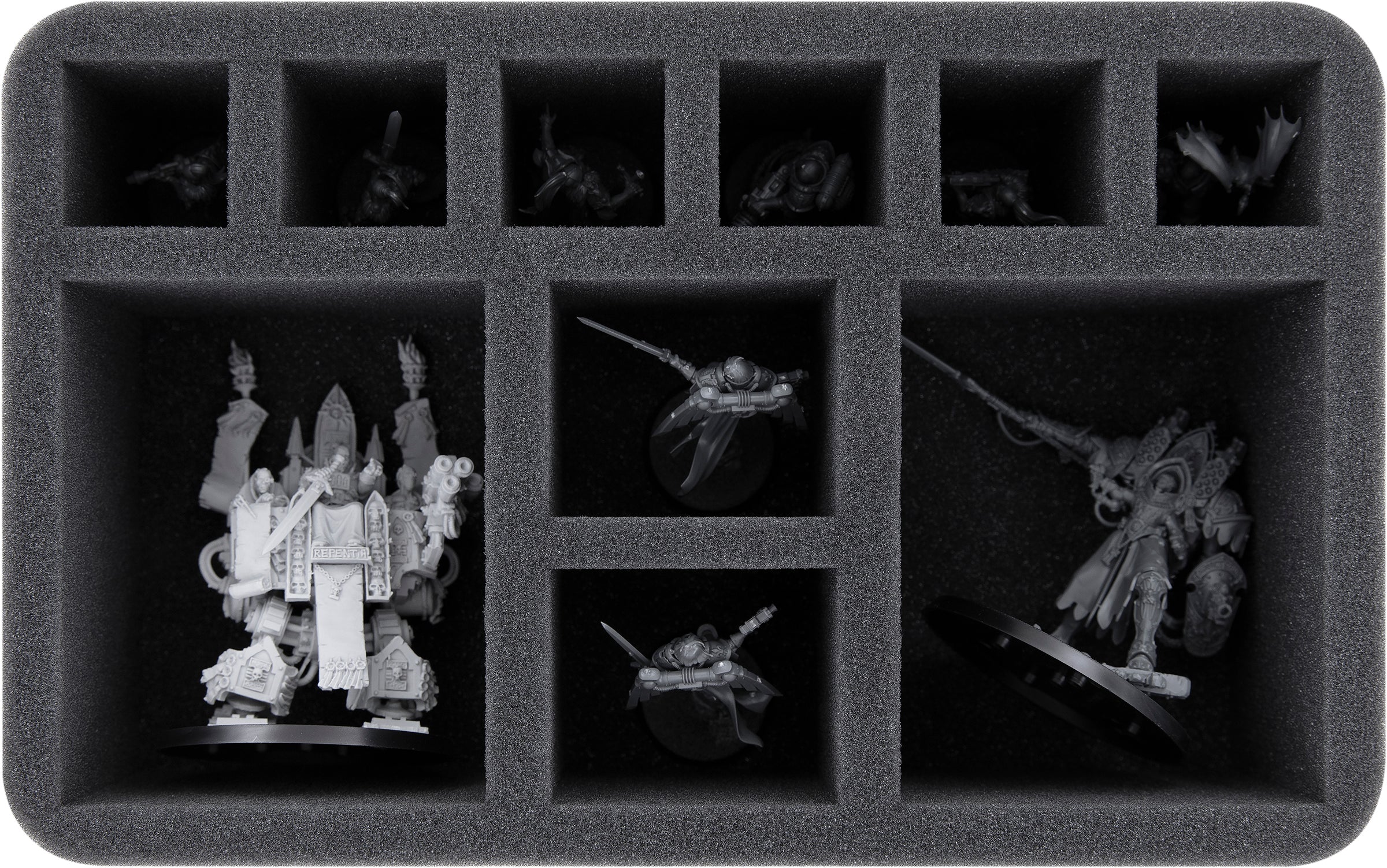 Dalle Morvenn Vahl alle Sorelle della Battaglia, dalle Celestian Sacresants alle possenti Paragon War Suits, ogni modello è assegnato allo scomparto appropriato e protetto in modo ottimale da danni dovuti ad abrasioni o collisioni. I numerosi dettagli in filigrana sono al sicuro grazie alla morbida schiuma. Anche gli miniature verniciati sono immuni da graffi e scheggiature.
