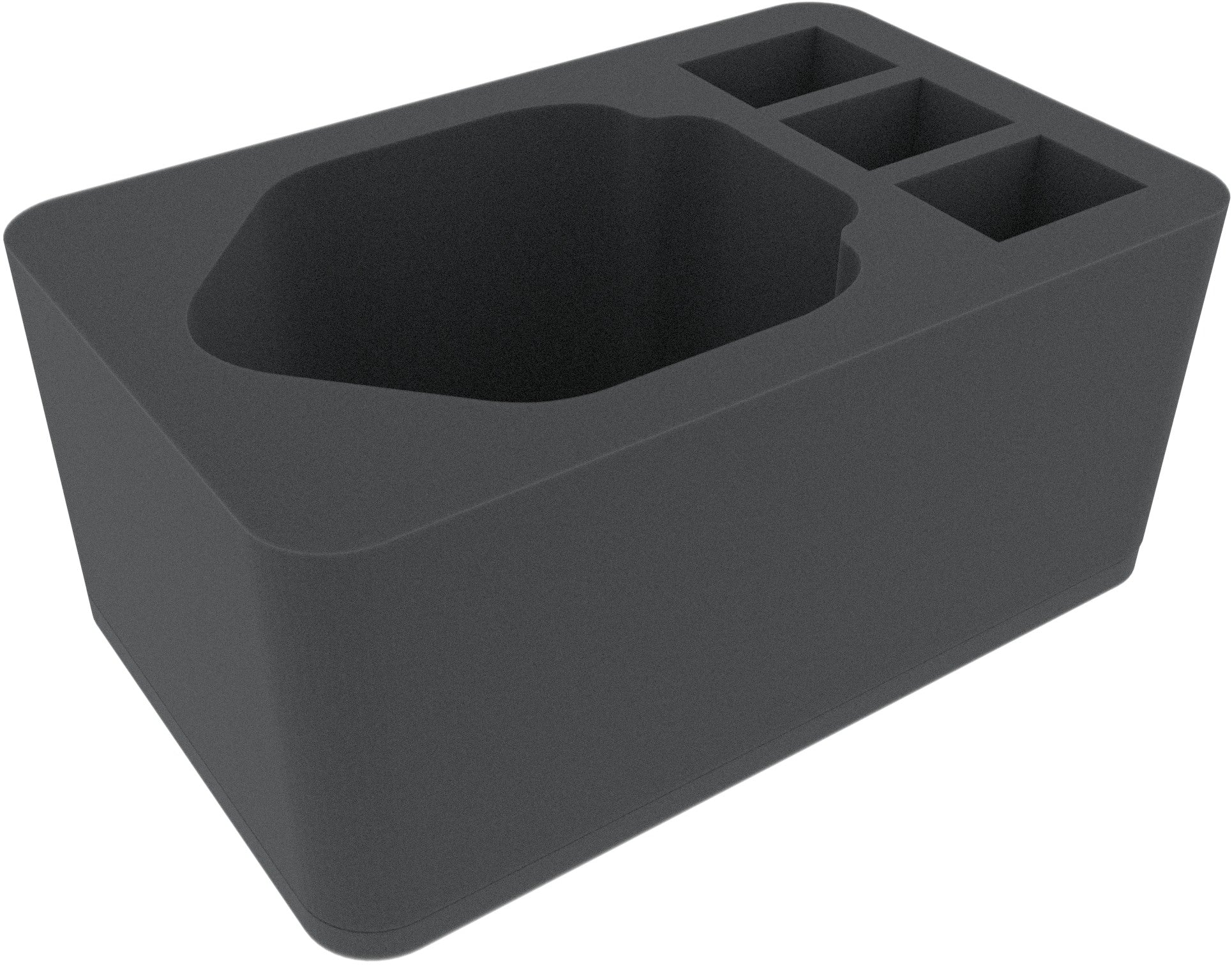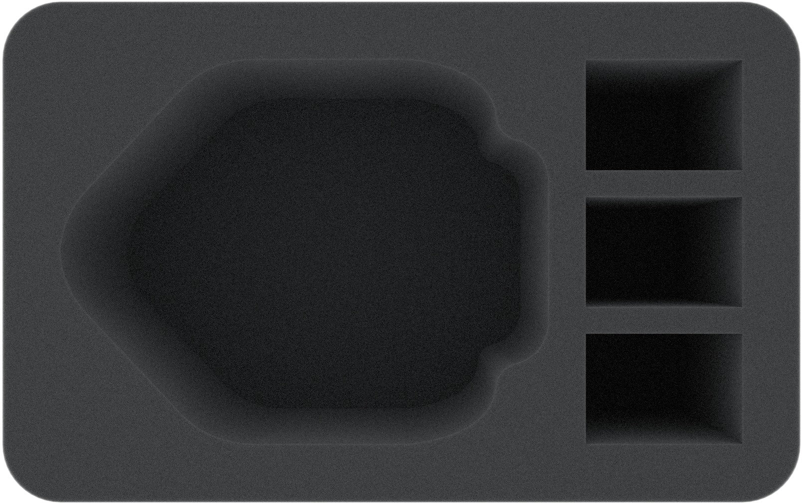 Questo inserto in schiuma Half-Size ha 4 scomparti di diverse dimensioni, un grande scomparto e tre rettangolari più piccoli. Il grande scomparto è particolarmente adatto per mostri più grandi o miniature di veicoli di vari giochi da tavolo e sistemi da tavolo. I modelli piccoli possono essere riposti nei piccoli scomparti.