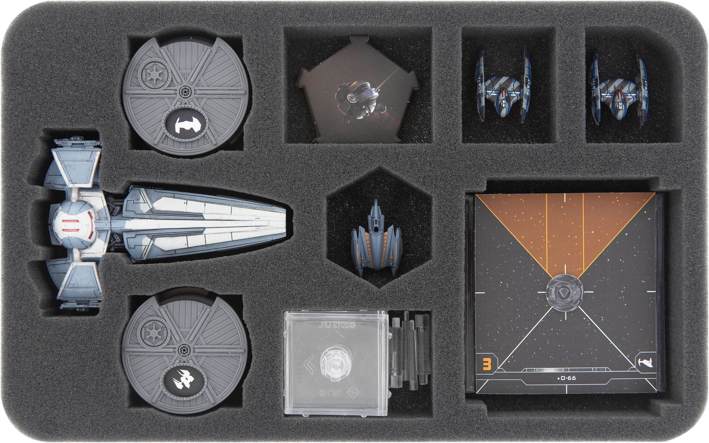 Uno scomparto dal taglio preciso in miniatura offre al Sith Infiltrator un posto sicuro su questo inserto Half-Size. Il modello si adatta in entrambi i modi, con le ali ripiegate dentro o fuori. Il taglio su misura impedisce che la miniatura della nave scivoli durante il trasporto e quindi non solo protegge le ali da danni, ma anche i colori da abrasioni e graffi.
