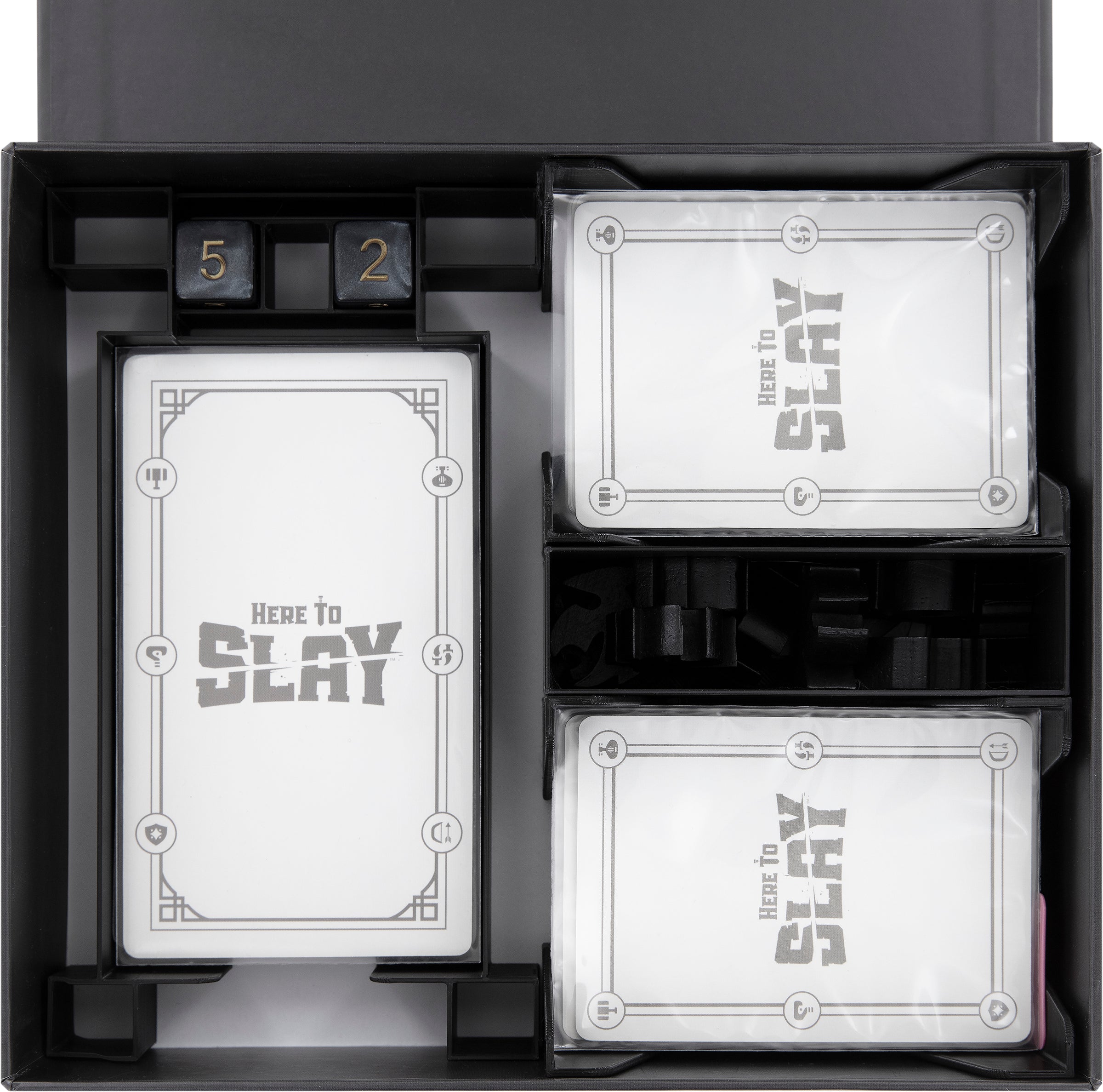 - L'Organizer si inserisce all'interno della scatola originale del gioco da tavolo dell'esclusiva Kickstarter "Here to Slay" - Exclusive Edition.