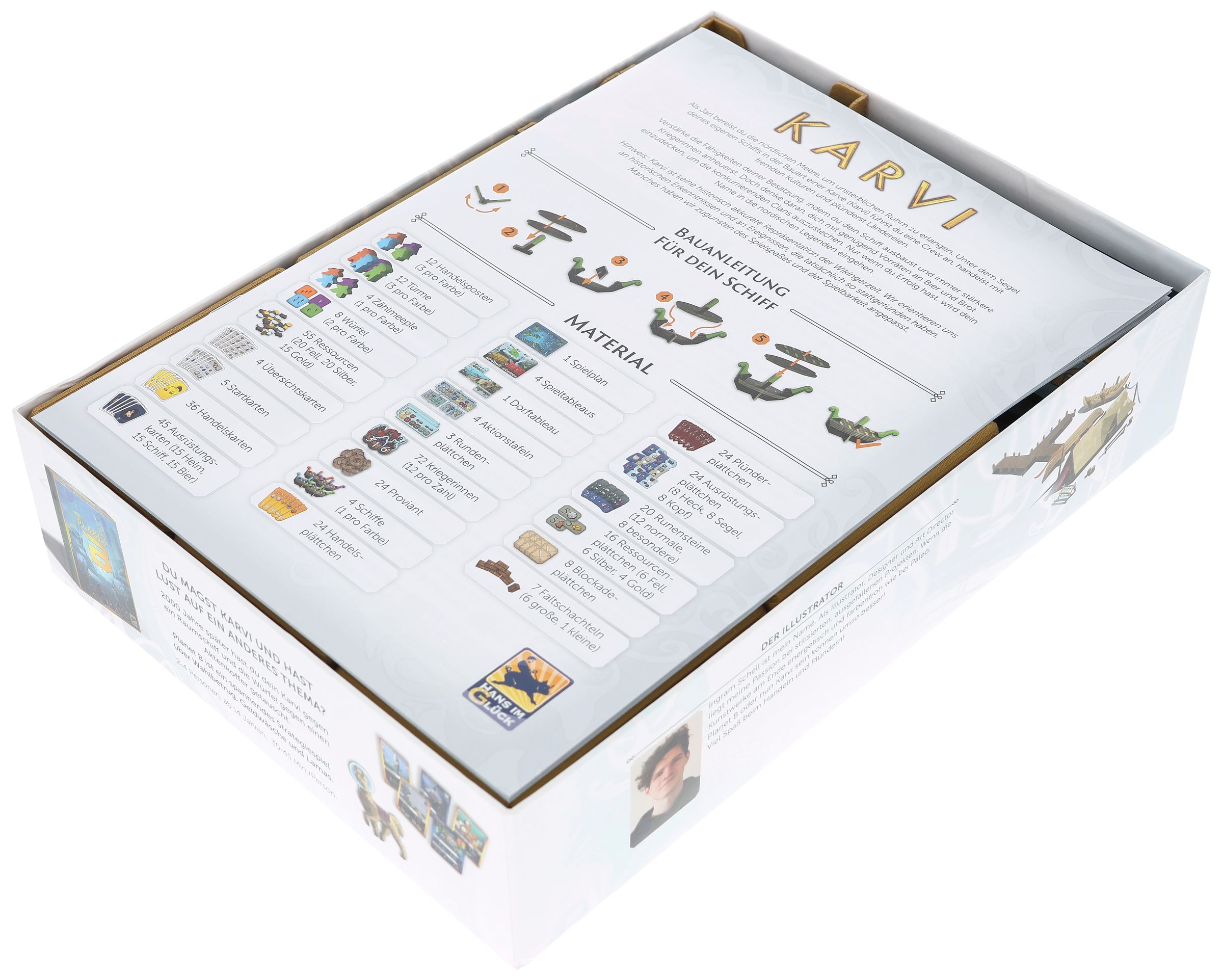 I Vichinghi salpano per esplorare nuove terre e conquistare ricchezze. L'inserto Feldherr Organizer per la scatola del gioco base Karvi vi aiuta a ottimizzare il setup del gioco e a riporre i materiali in modo sicuro, poco ingombrante e ben organizzato.
