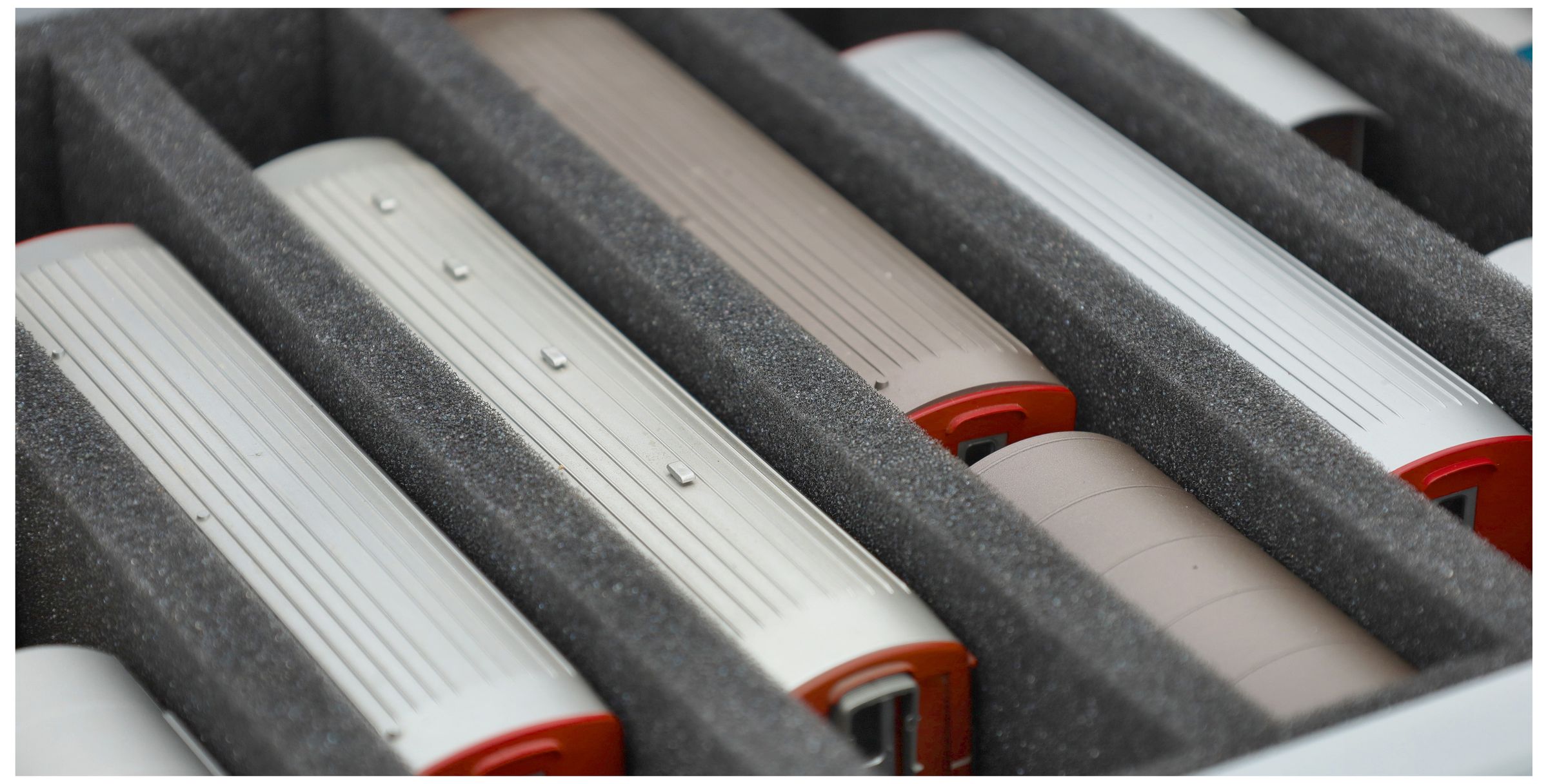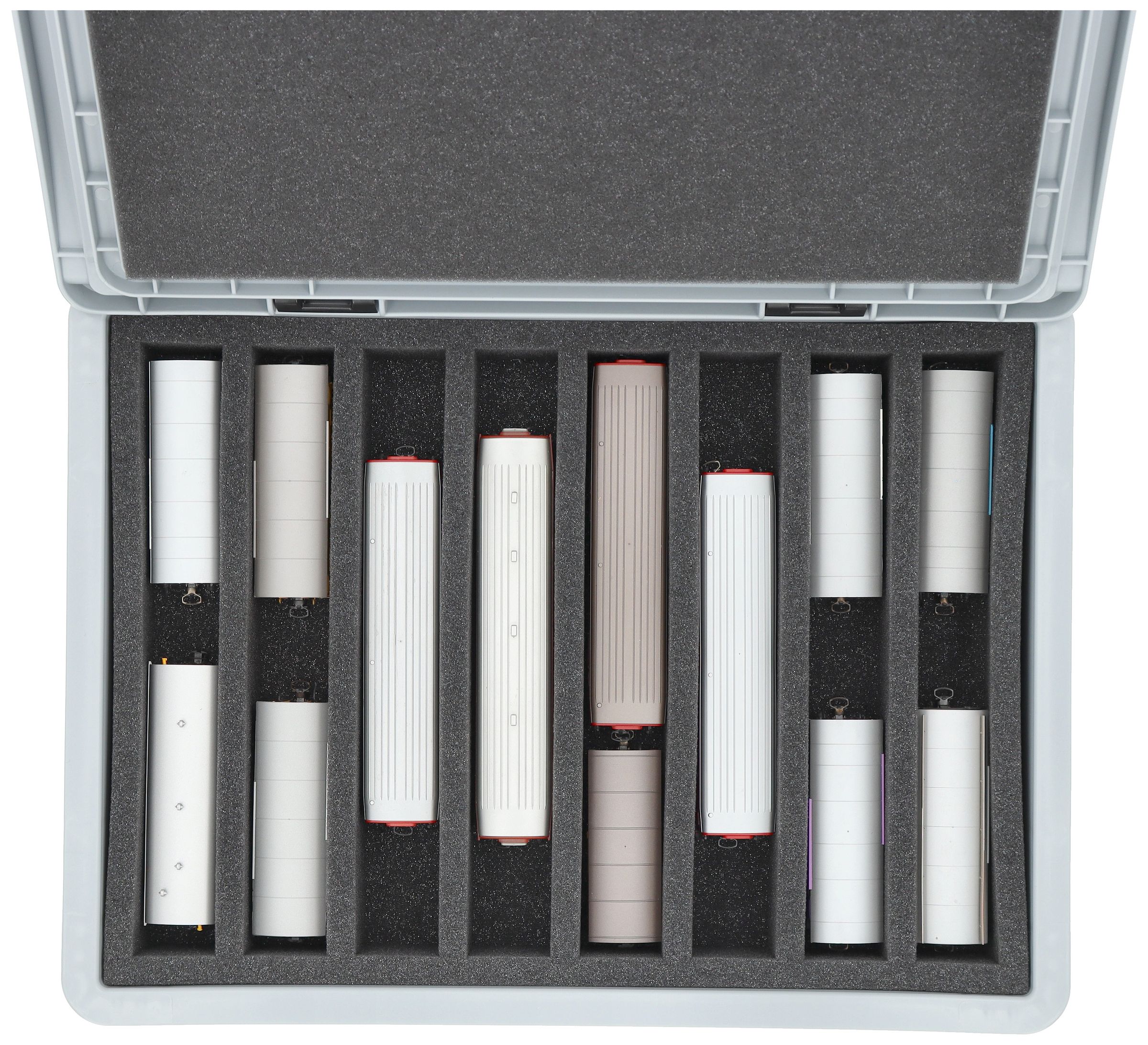 The 8 equal-sized compartments (each approx. 246 x 33 x 45 mm) are specially designed for H0m scale models. The precise fit keeps your models securely in place during transport.