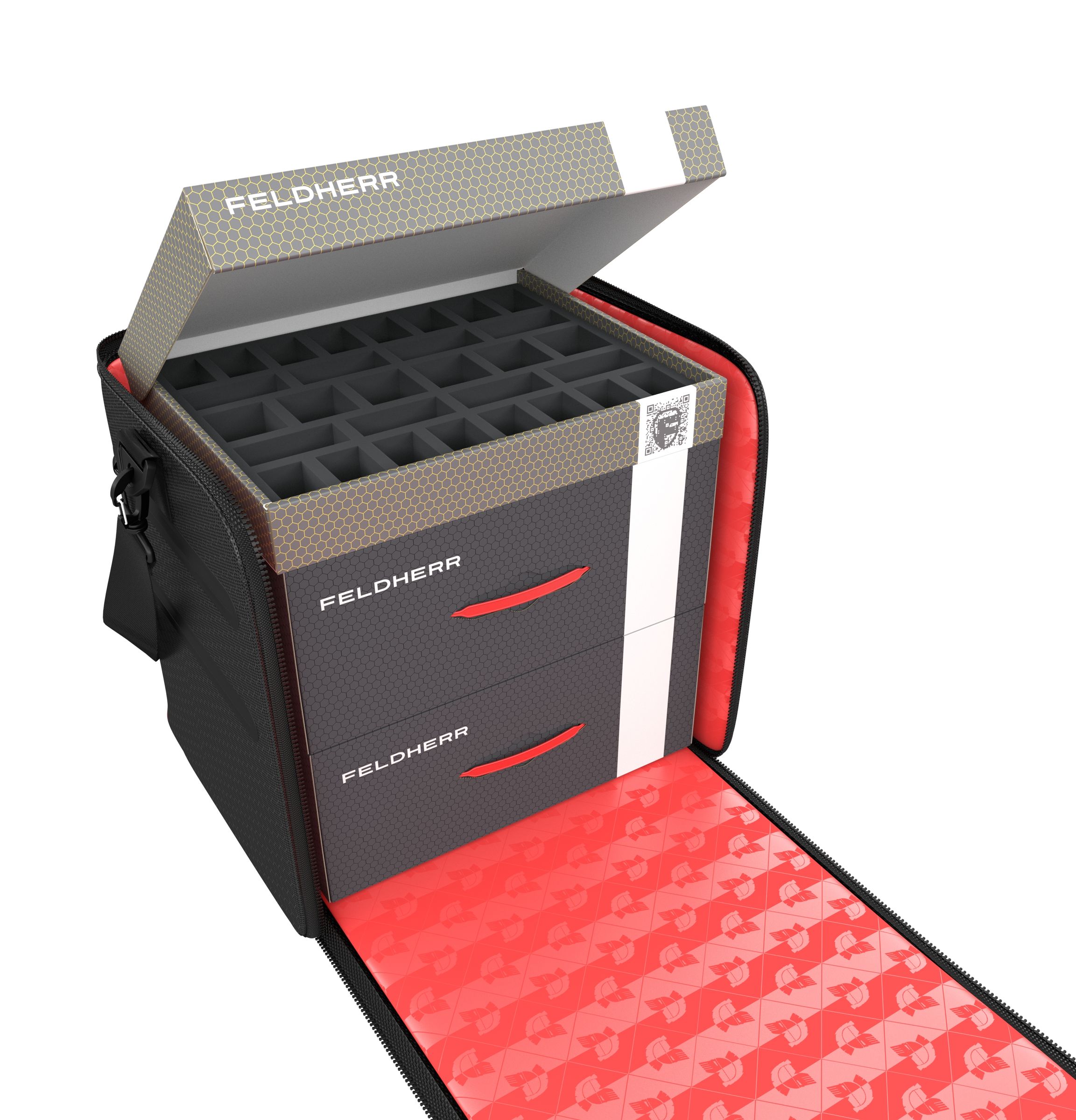 In questo spazioso GENERAL 370 borsa i vostri miniature sono protetti in modo ottimale. Potete trasportare in tutta sicurezza fino a 86 figure di guerrieri e 8 carri armati sul campo di battaglia con gli Feldherr Vassoio per schuma personalizzati.