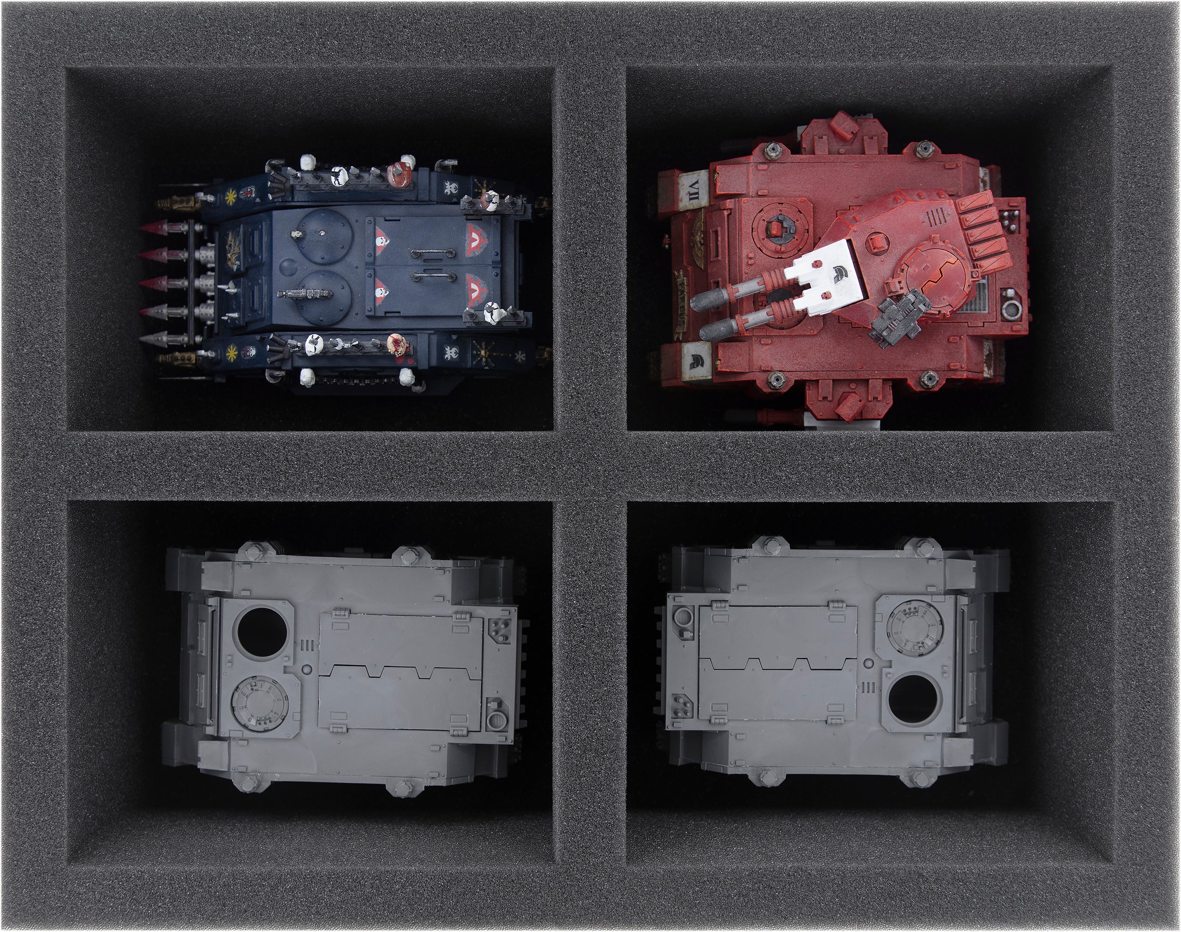 Due Full-Size e tre Half-Size Vassoio per schuma offrono una protezione ottimale per i vostri modelli. Ogni modello ha il proprio scomparto, dal Venerabile Land Raider al possente Blade Champion. Gli scomparti tagliati su misura assicurano che le vostre figure siano ben aderenti e rimangano saldamente al loro posto anche durante il trasporto attraverso il Palazzo Imperiale. La morbida schiuma protegge i vostri miniature da eventuali danni, assicurando che le vostre unità dipinte arrivino al tavolo da gioco senza graffi o scheggiature di vernice.