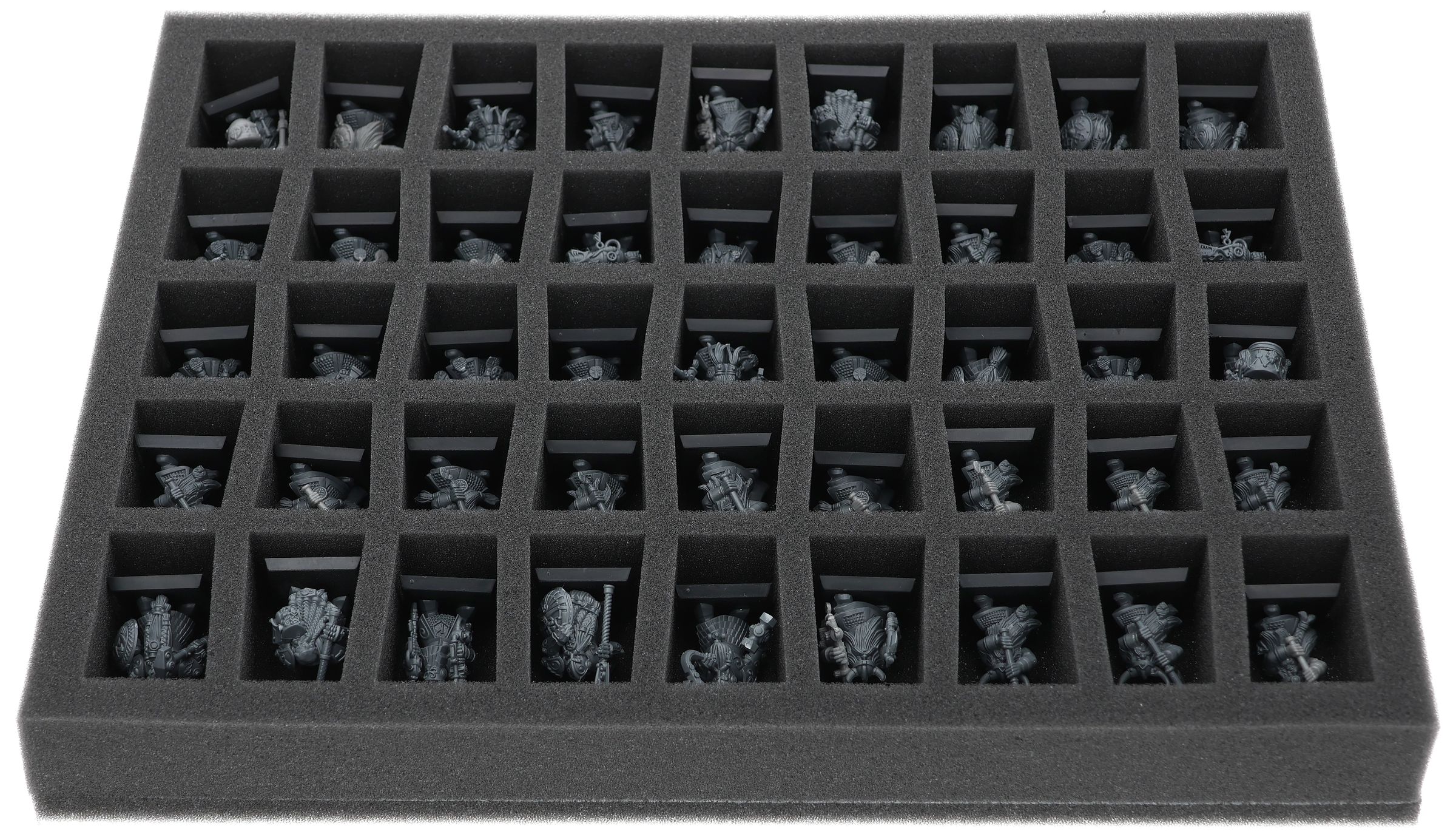 Su questo vassoio di schiuma Feldherr c'è spazio per un massimo di 45 miniature del vostro esercito. L'inserto è particolarmente adatto per riporre i Guerrieri Nani, i Nani Quarrelers, i Nani Ironbreakers, i Nani Hammerers, i Nani Slayers e modelli di dimensioni simili.