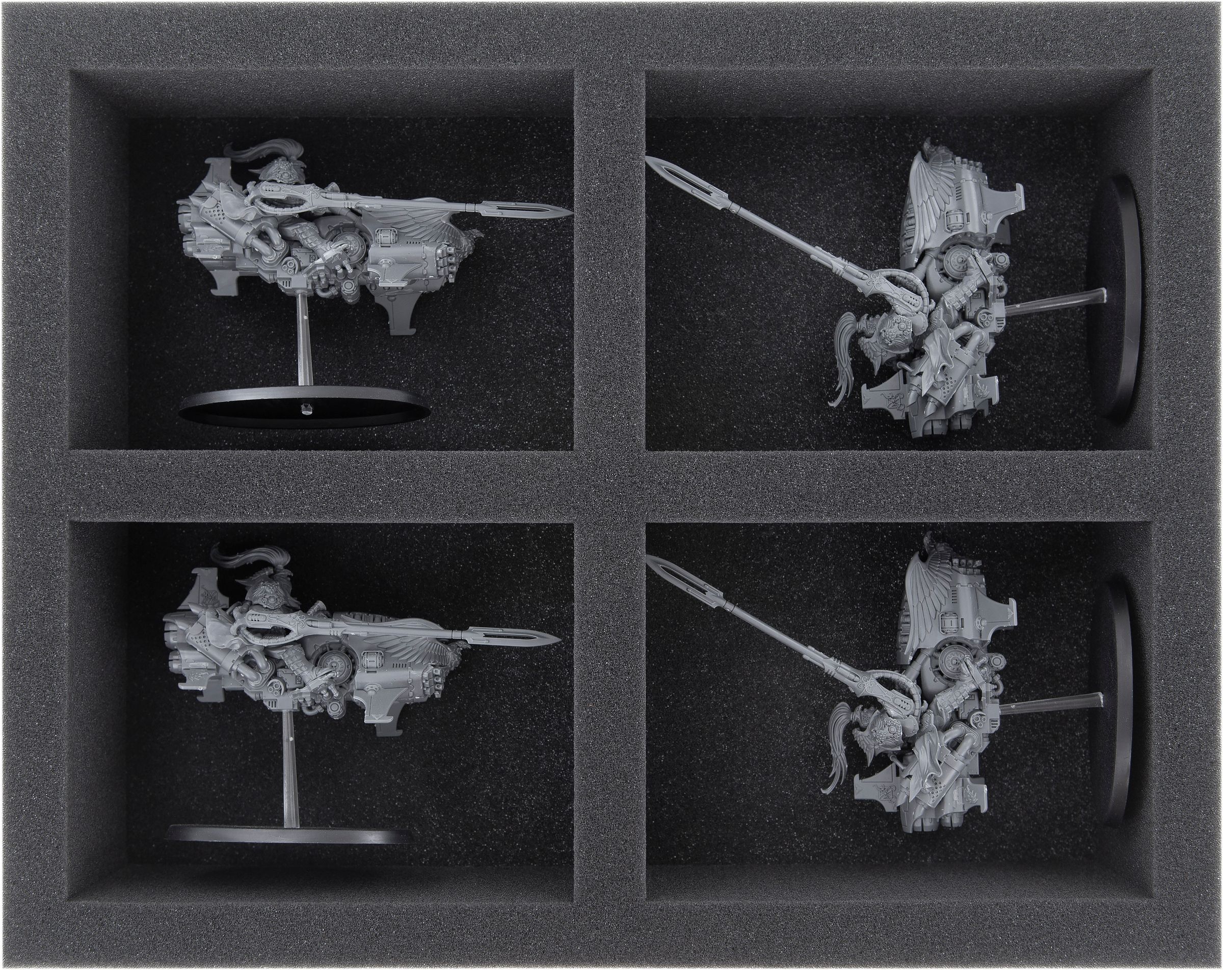 To prevent broken lances from your Vertus Praetors, stow your golden warriors in the insert with four compartments. The generously sized compartments leave enough room for bulky models, like a Shield Captain with a raised lance.