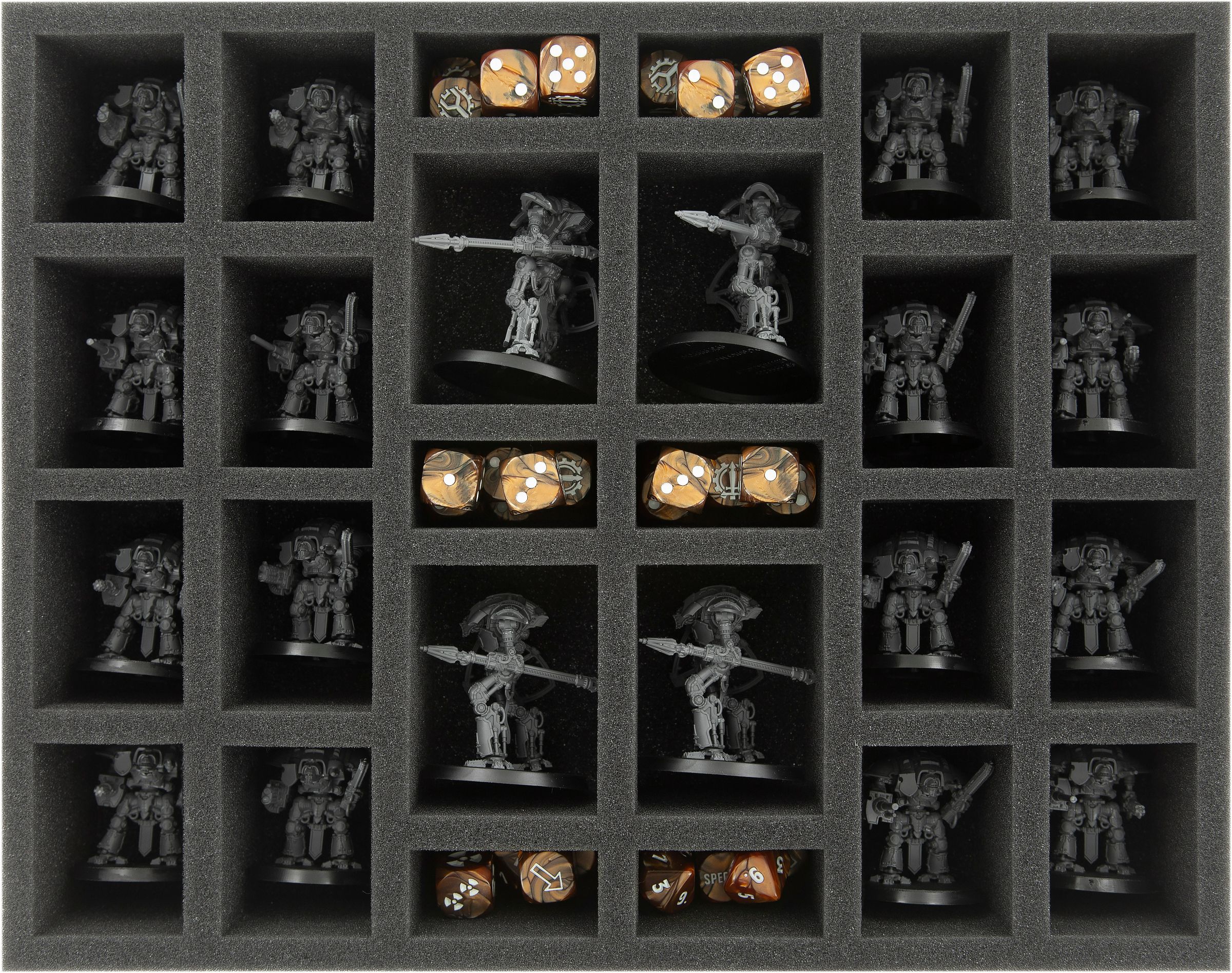 The foam tray with the 26 compartments is ideally suited to hold other Adeptus Titanicus models. 4 compartments will fit for Imperial Cerastus Knights, 16 further compartments will hold e. g. Imperial Knights. The remaining 6 small compartments are suitable to hold small game material like tokens and dice.