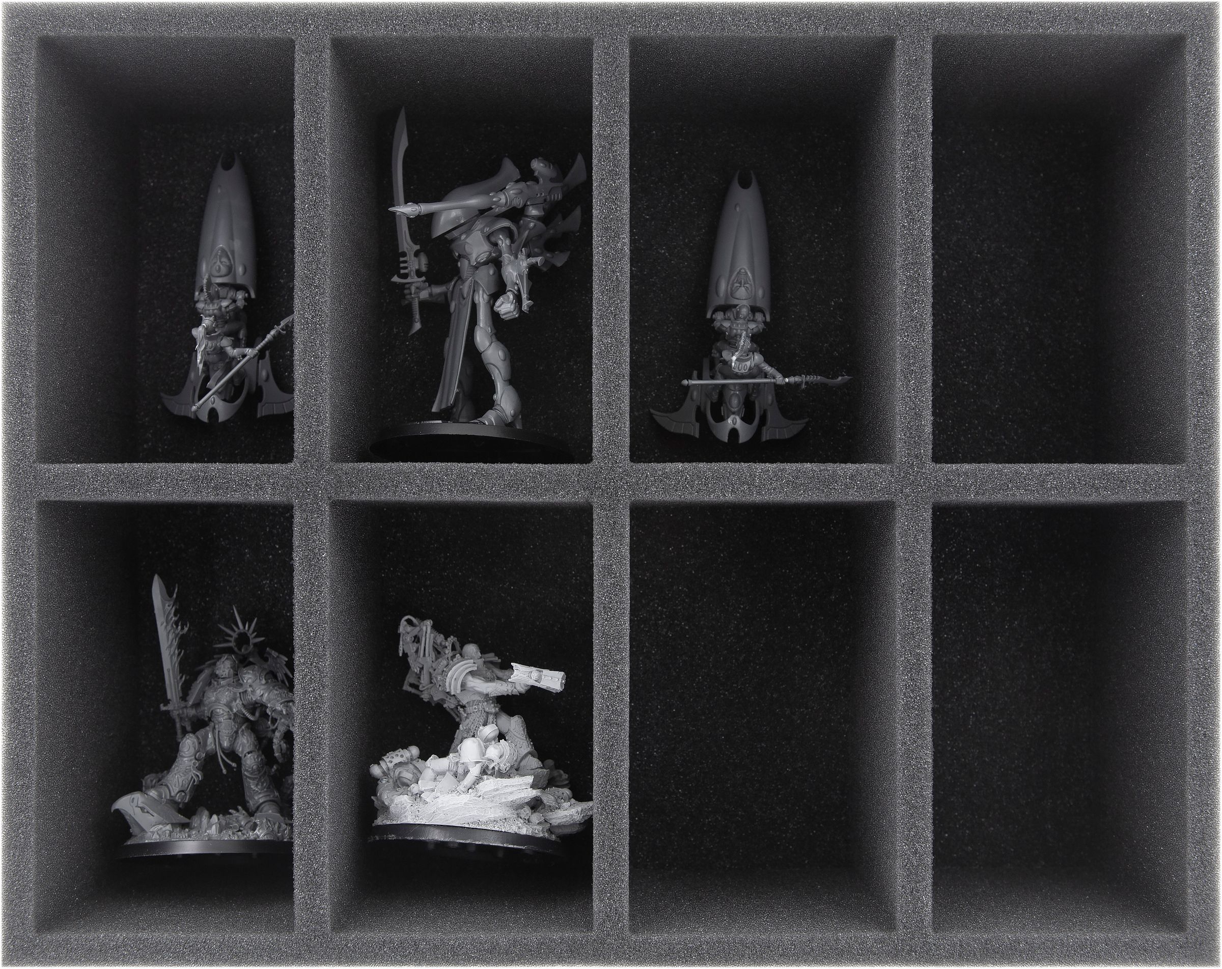 • 1 Full-Size foam tray with 8 compartments for big models like Wraithlords, units on Jetbikes like Skyrunner, Shroud Runners or Windriders and models with similar dimensions (FS090A001)