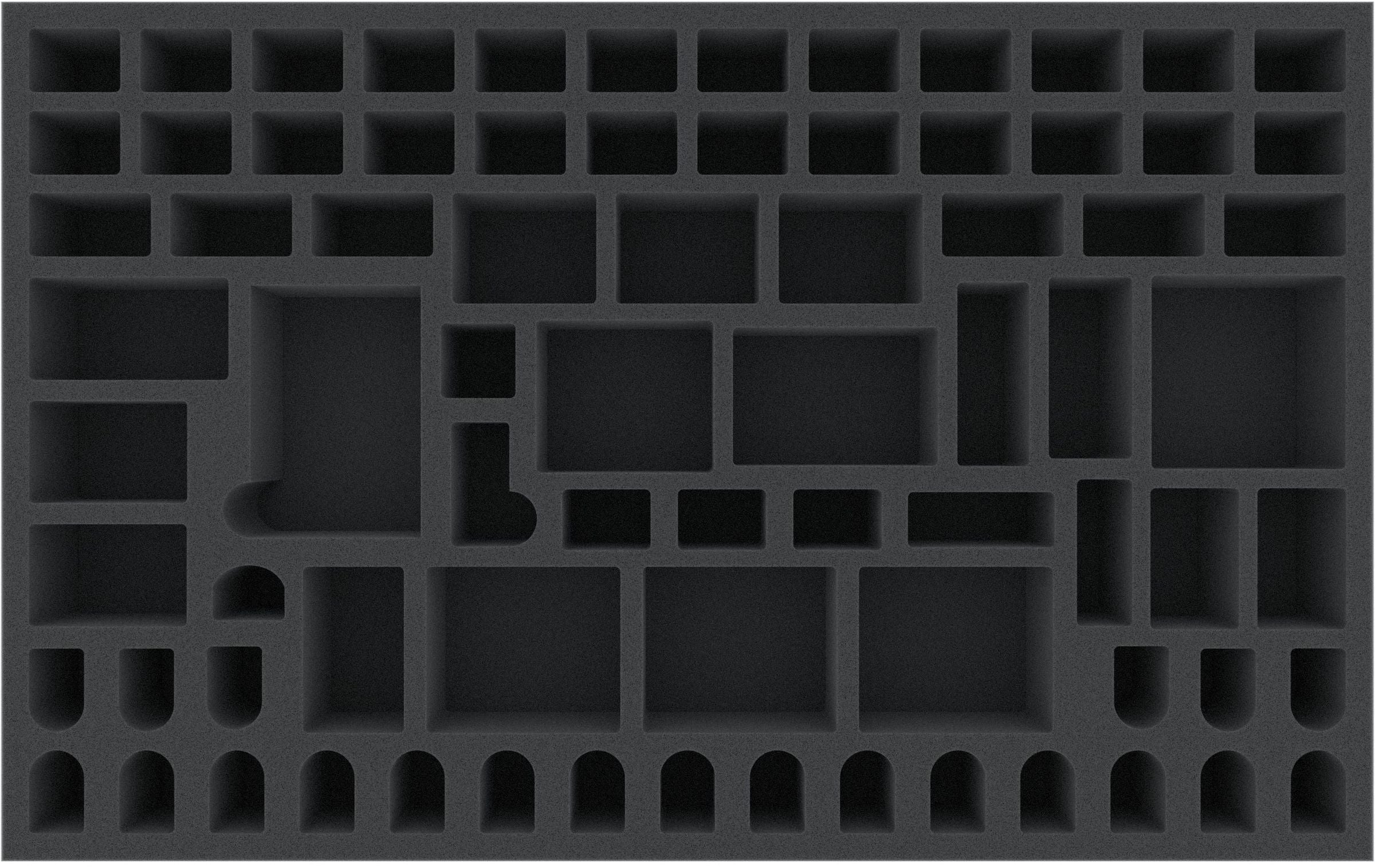 The top rows of the foam insert are reserved for your heroes and the monsters. From Goblin to the winged Gargoyle, each of the 35 miniatures has its own compartment. The custom-fit cut ensures that nothing slips around during transport. Sensitive parts such as swords, scythes or wings are thus optimally protected from damage. If you have painted your models, you can be sure that the colors are still free from harm, like scratches or abrasion, after transport.