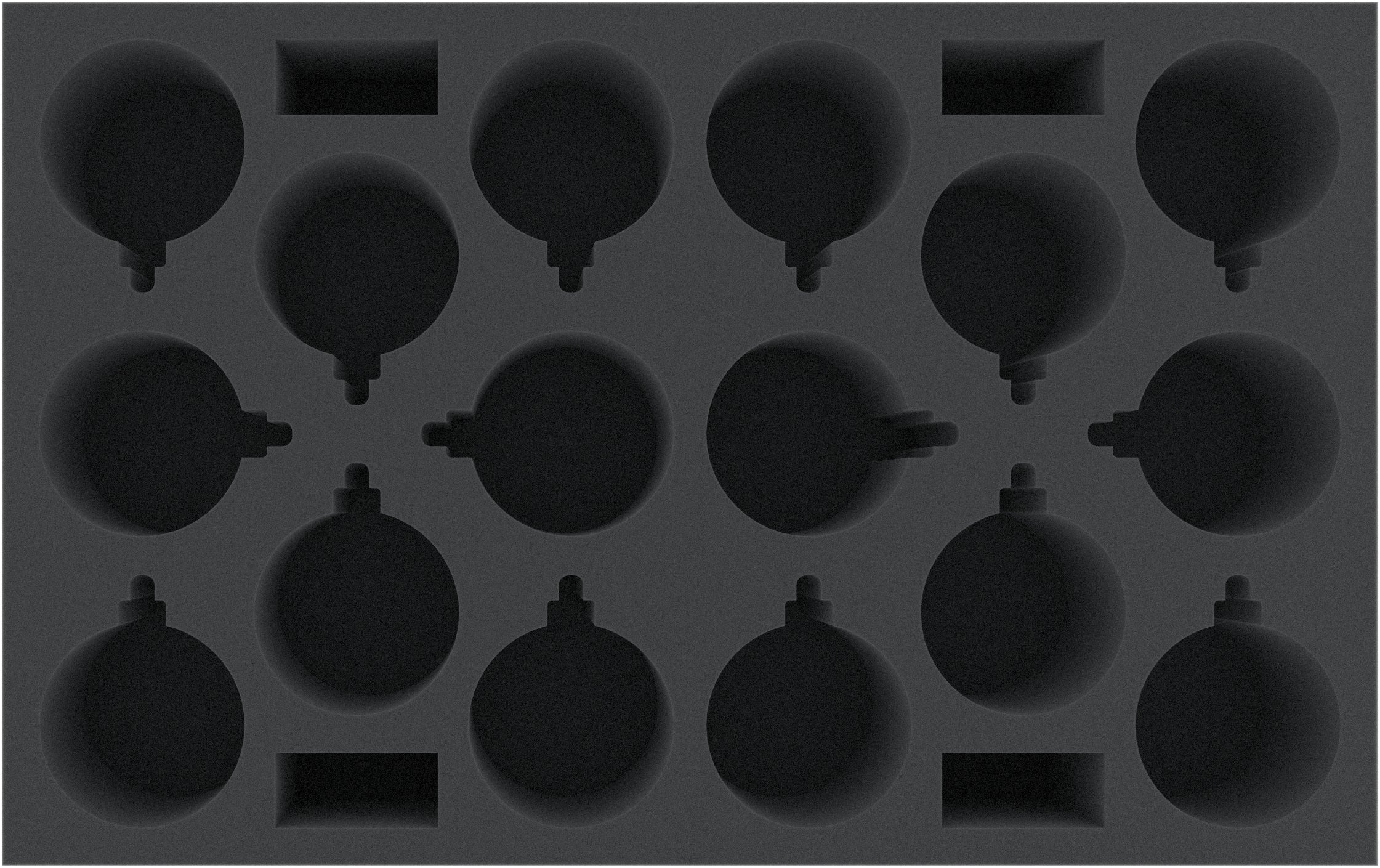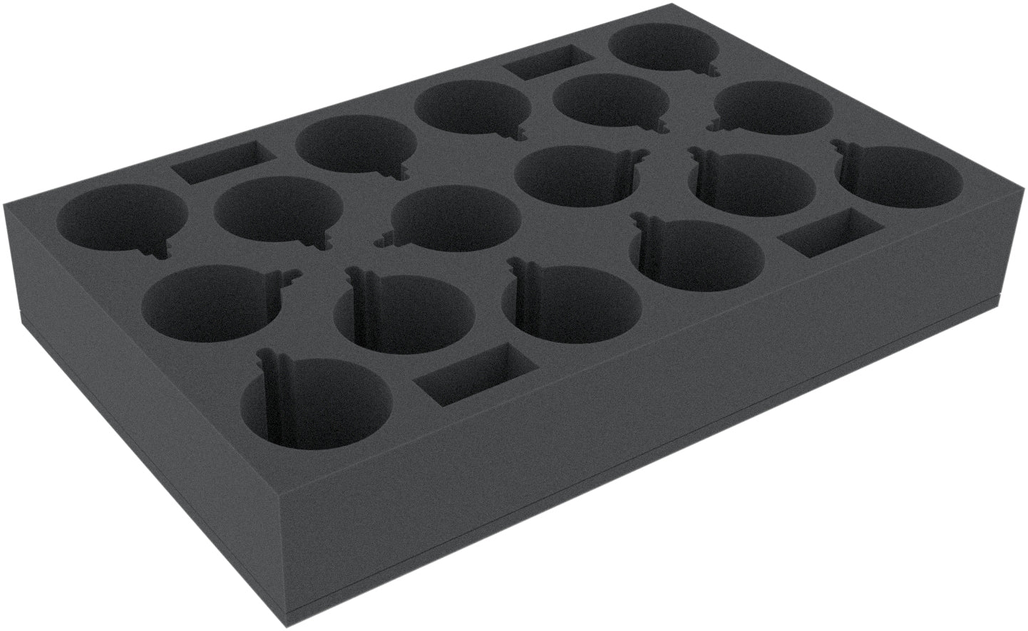 A 90 mm high foam insert with 16 circular compartments of 80 mm diameter with small bell- or lamp-shaped extension.