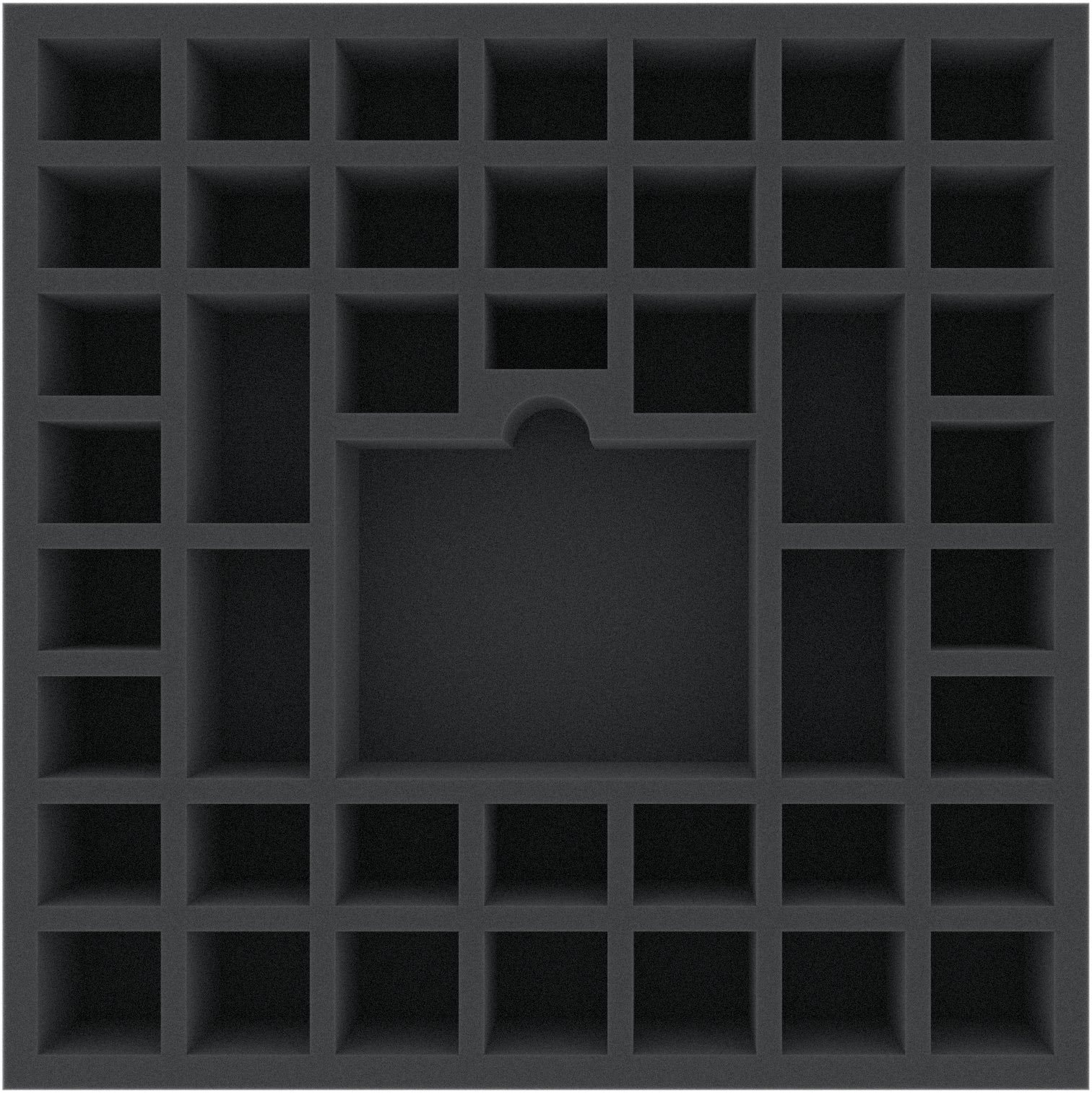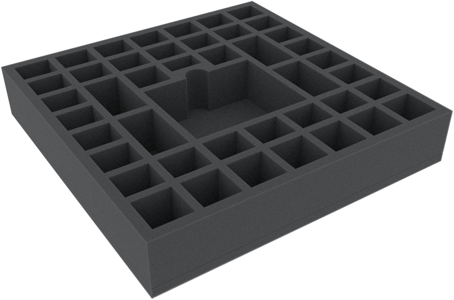 This foam tray is divided into 44 compartments of different sizes. It is particularly suitable for the safe storage of miniatures of various board games. It can also be used to sort accessories such as tokens, cards, and dice.