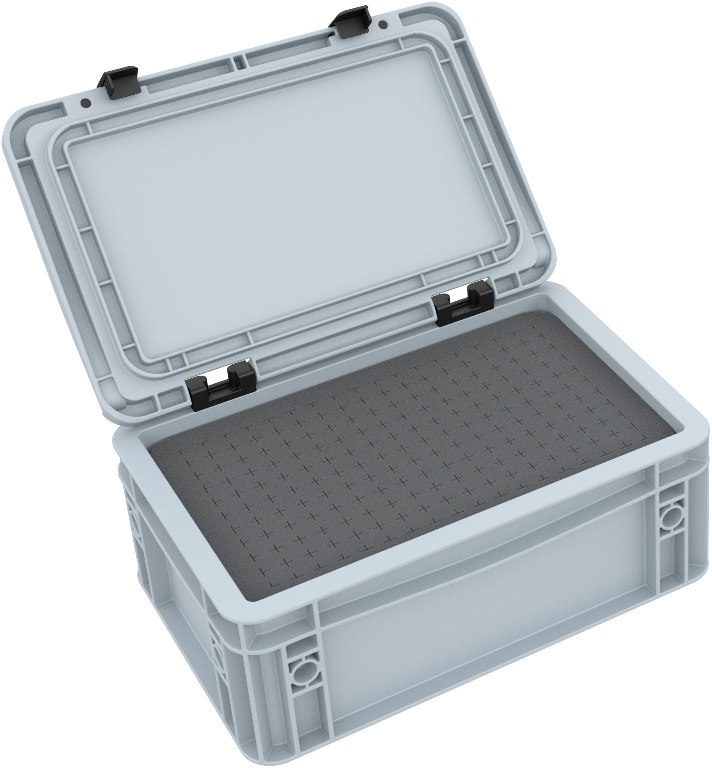 Set of Eurobox filled with Pick and Pluck foam inserts and matching bottom and cover sheets made from open cell PU foam.