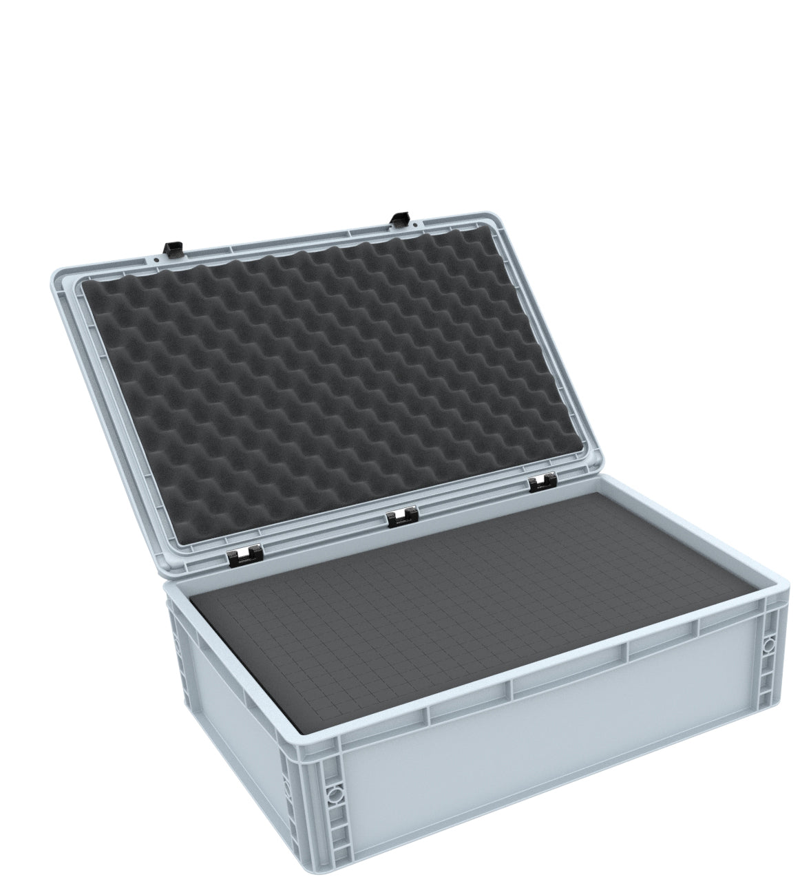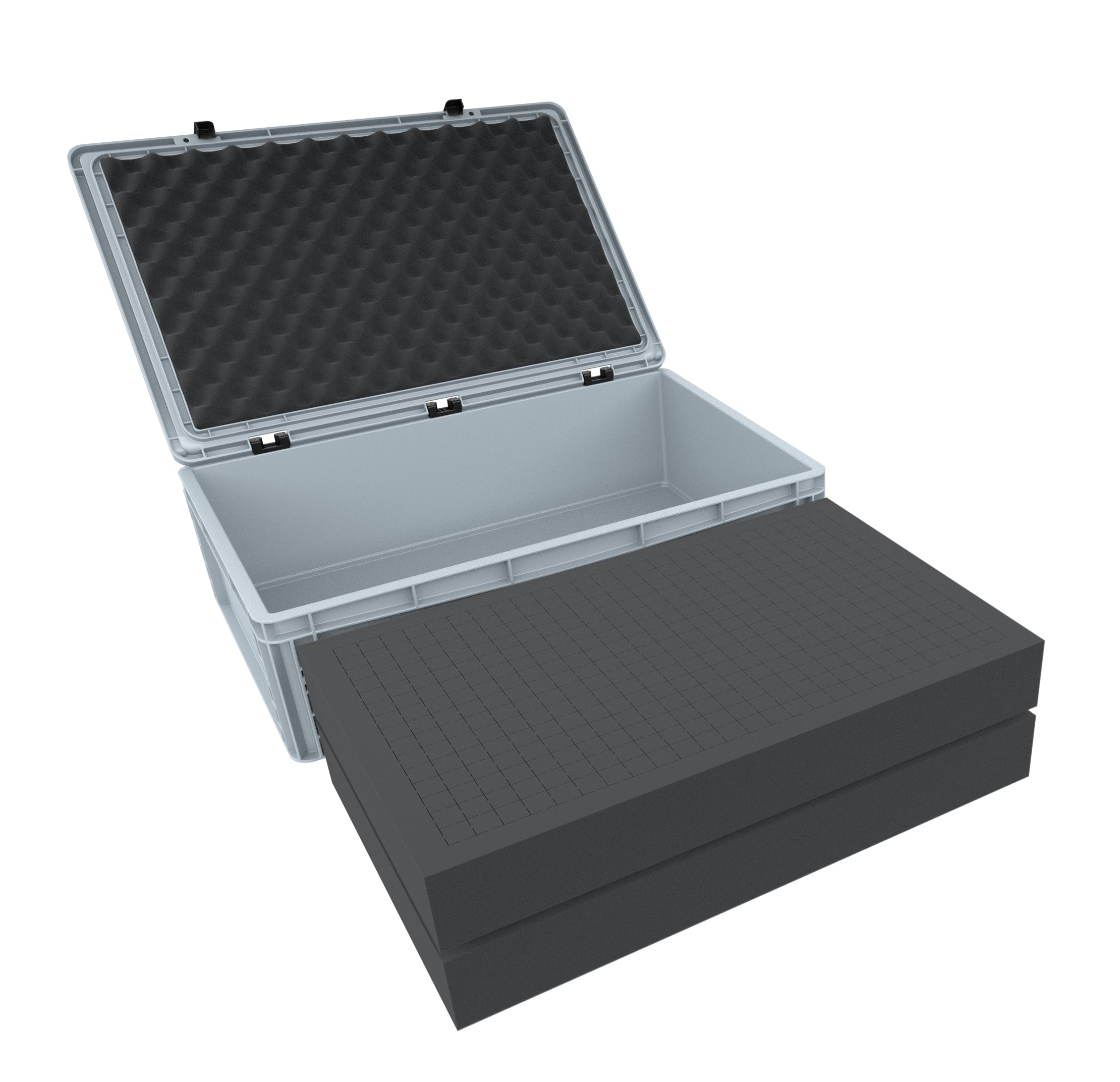 Set of Eurobox 600 mm x 400 mm x 185 mm filled with 2 Pick and Pluck foam inserts. The grid of the foam allows an individual adaptation of the foam inserts to all shapes. It is ideally suited as protection for the transport of various industrial products such as medical equipment, tool components or technical equipment. The pick and pluck foam is perforated with a grid of 20 mm x 20 mm x height of the insert (70 mm) and a circumferential edge of 25 mm. As a bottom we use a 10 mm thick base (DS010B), which makes it possible to transport even heavy products. The nap foam serves as top cover and is cut exactly to fit the lid of Auer's Eurobox. Since it is equipped with a self-adhesive foil, you do not need any further tools. All you have to do is remove the adhesive foil from the foam insert and glue the self-adhesive side into the hinged top of the Eurobox. The entire set can therefore be designed, adapted and used according to your personal needs without special tools.