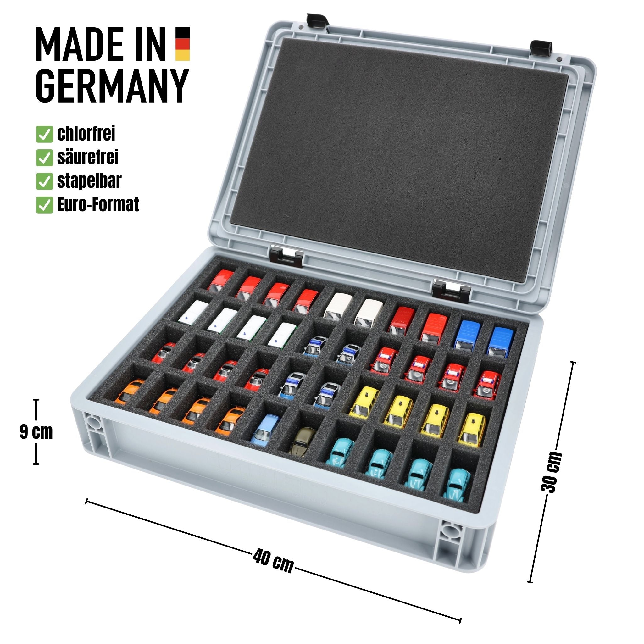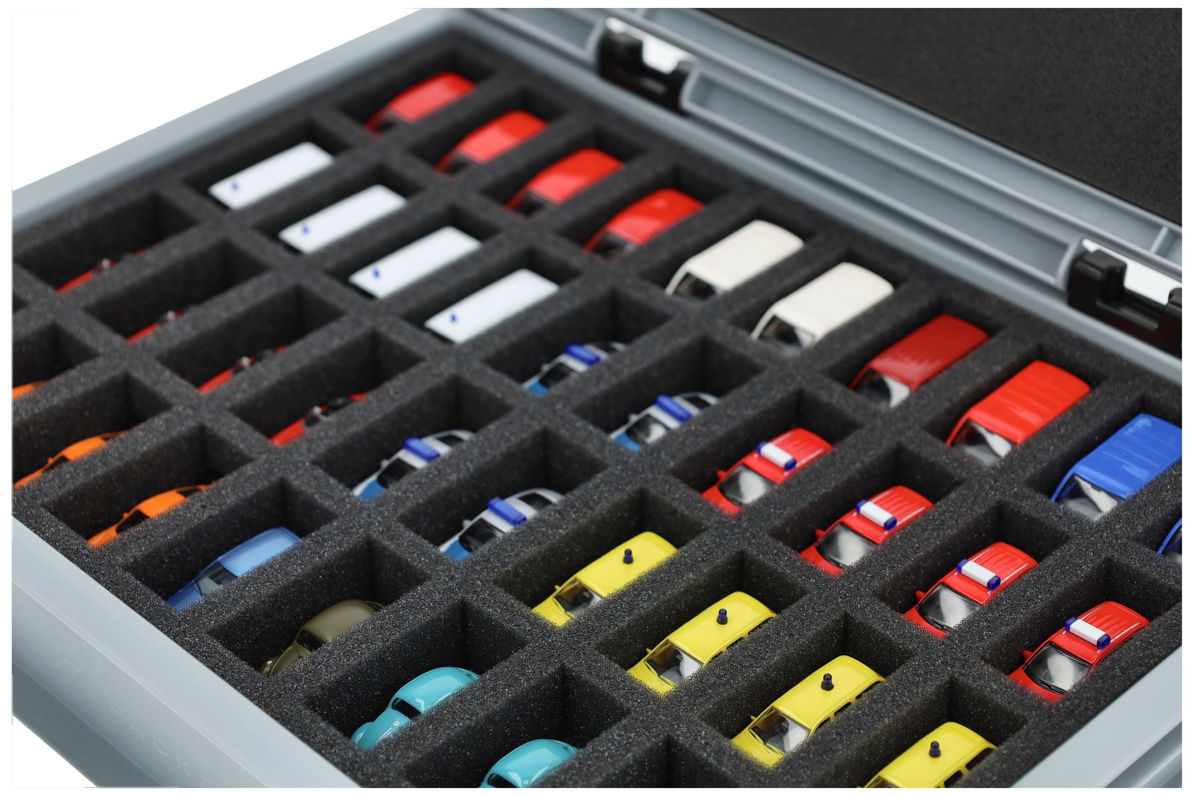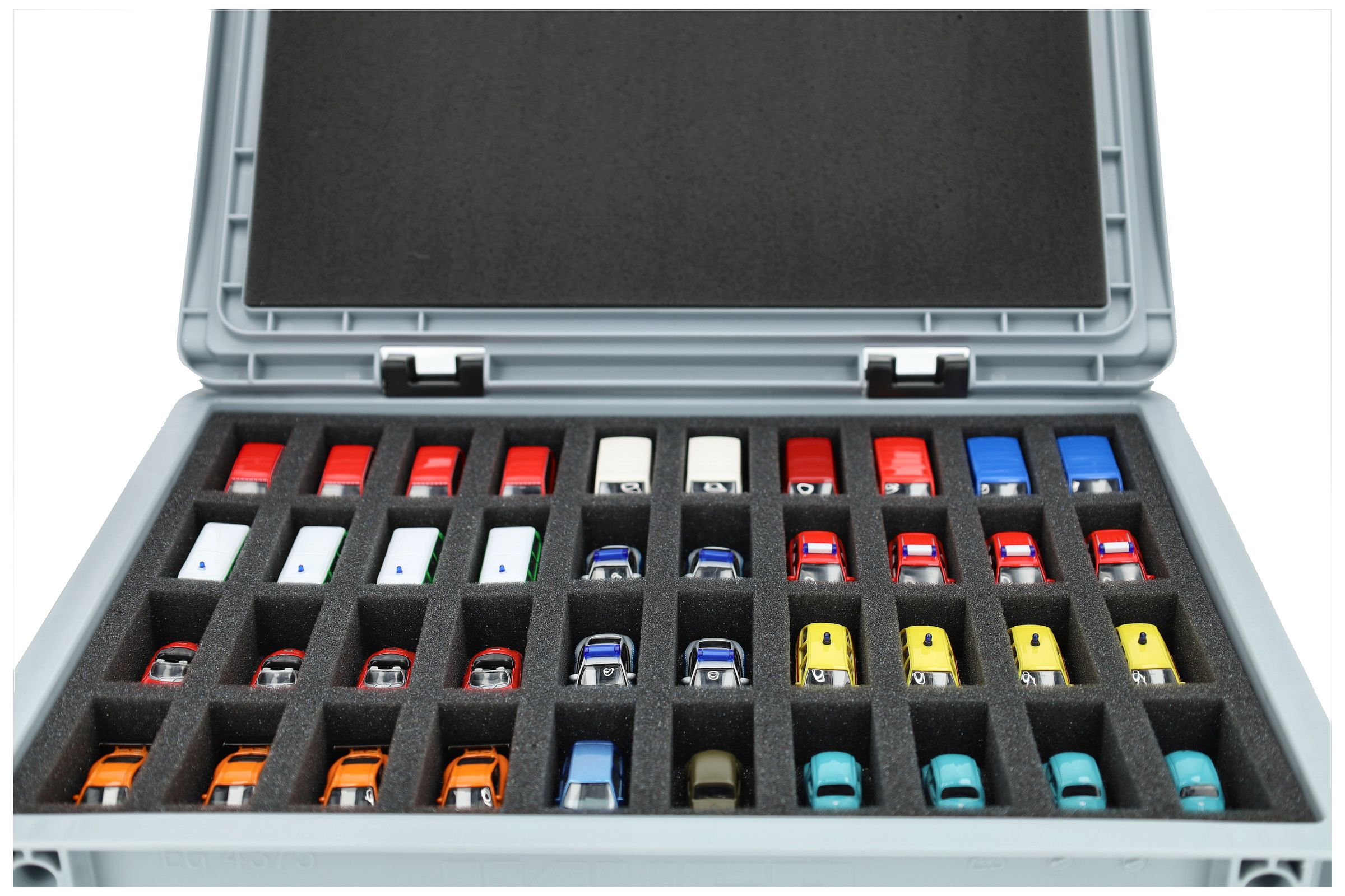 - Precision foam insert with 40 compartments for 1:87 scale vehicles - compartment dimensions approx. 56 x 25 x 25 mm