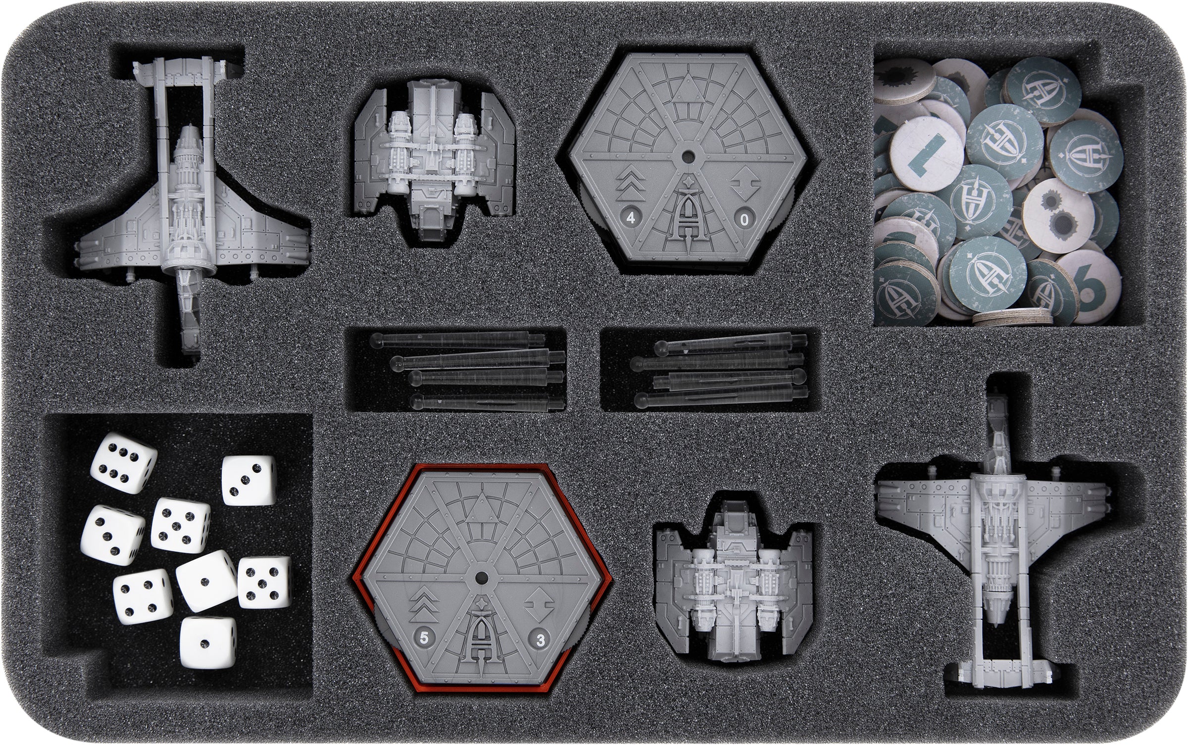 - 1 Half-Size foam tray with 4 compartments for each 2 miniatures of the Vulture Gunships and Arvus Lighters (HSMEZO035BO)