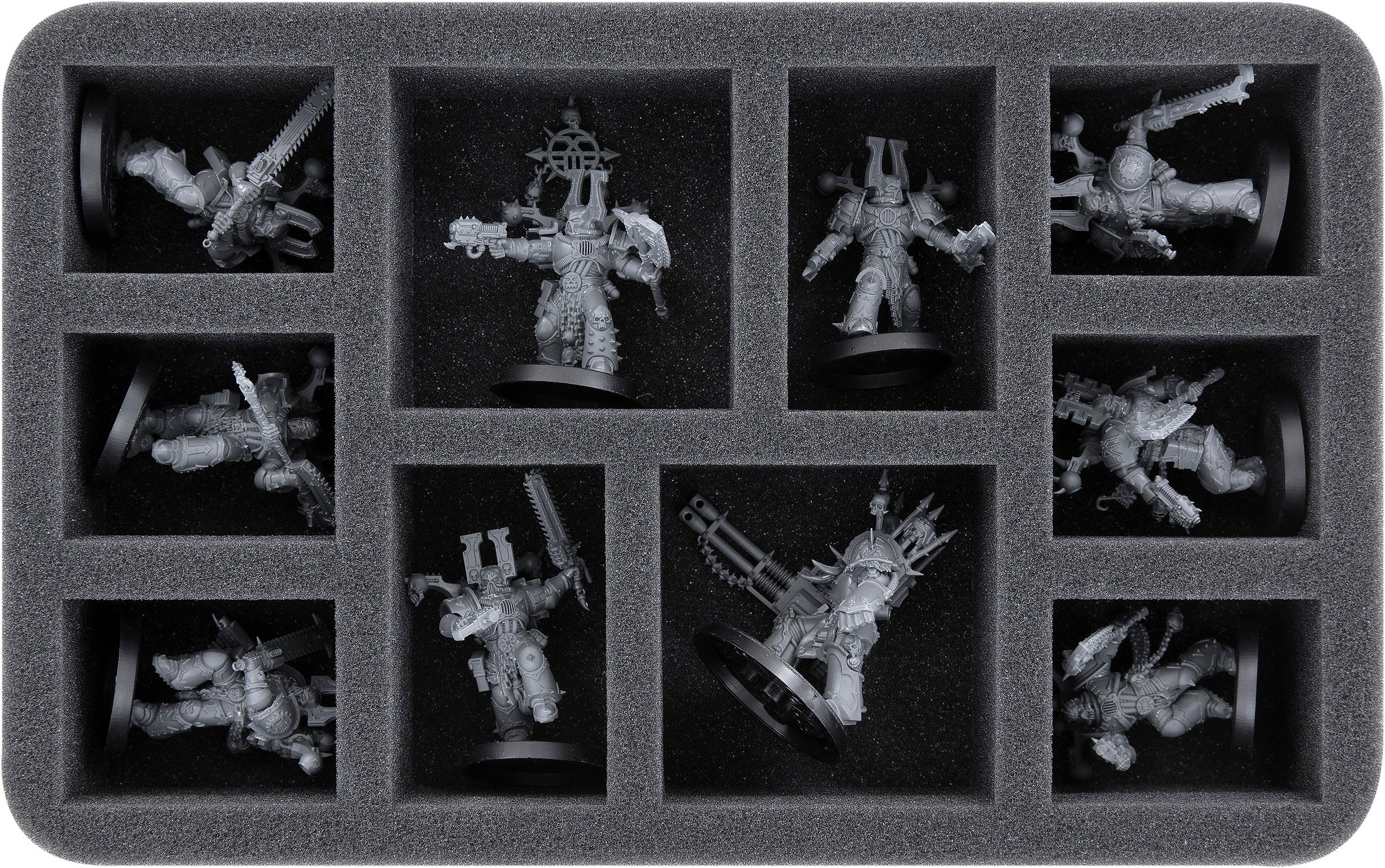 The foam tray has ten compartments. Each model gets its compartment. Ideal for transporting a small kill team or boarding party.