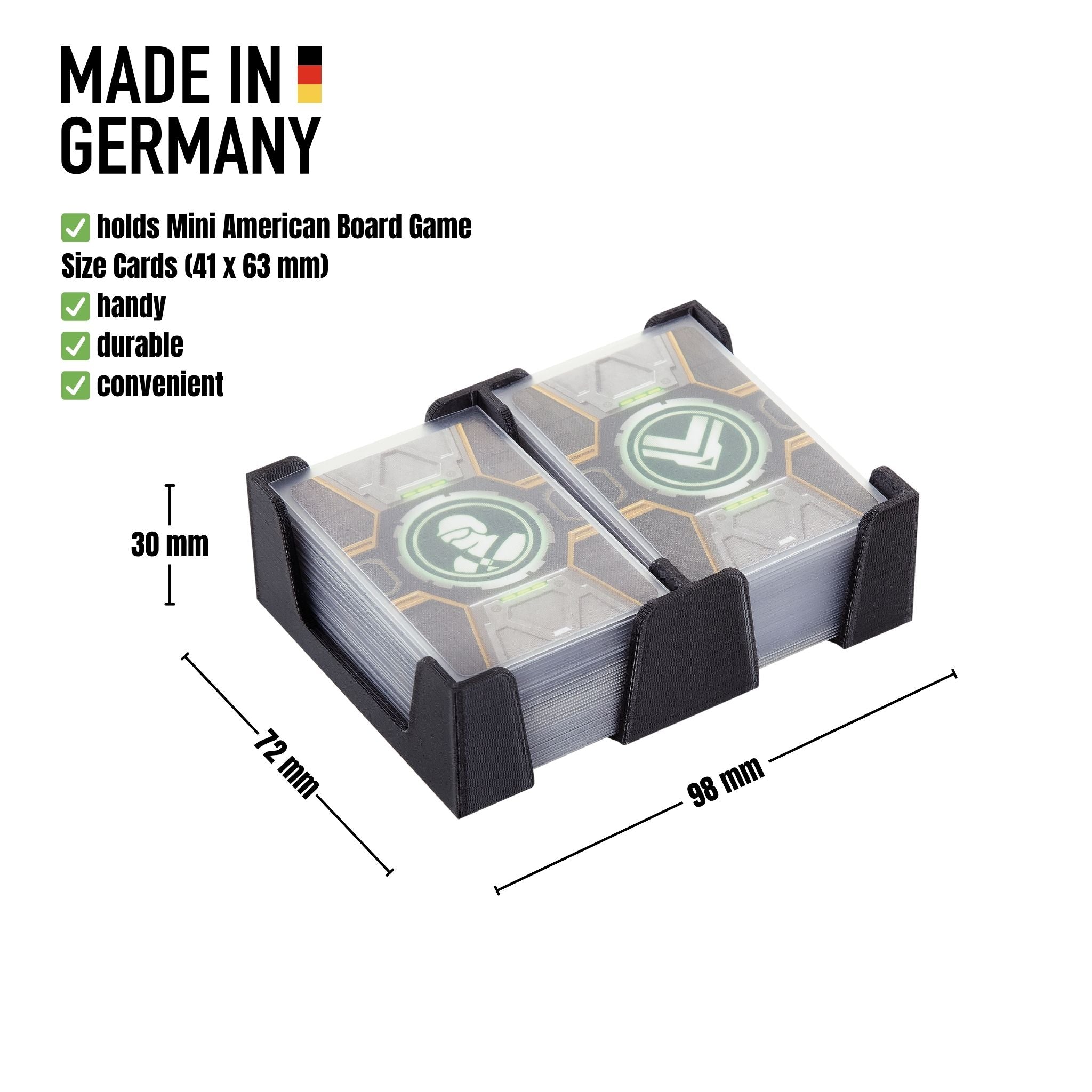 Whether it‘s tabletop, card game, or board game - The card holder saves nerves and time. It helps you to organize the different types of cards during the game, makes sure that the piles of cards do not fall over even when they‘re sleeved, and at the end of the game you can easily and neatly sort away your playing cards.