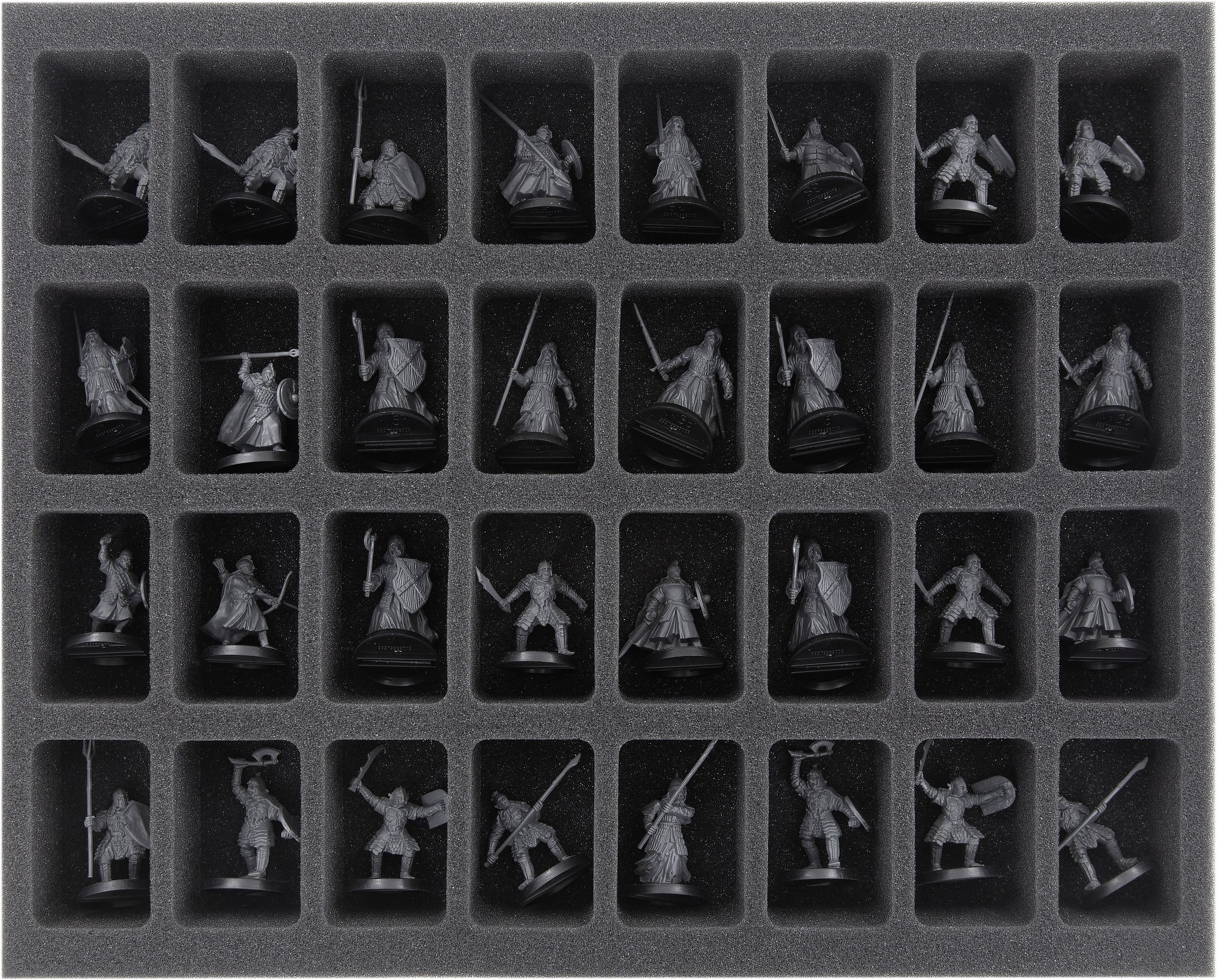 - The third insert with 2 round base-sized compartments provides a secure stand for the large figures and 34 compartments for warrior, rider and orc models.