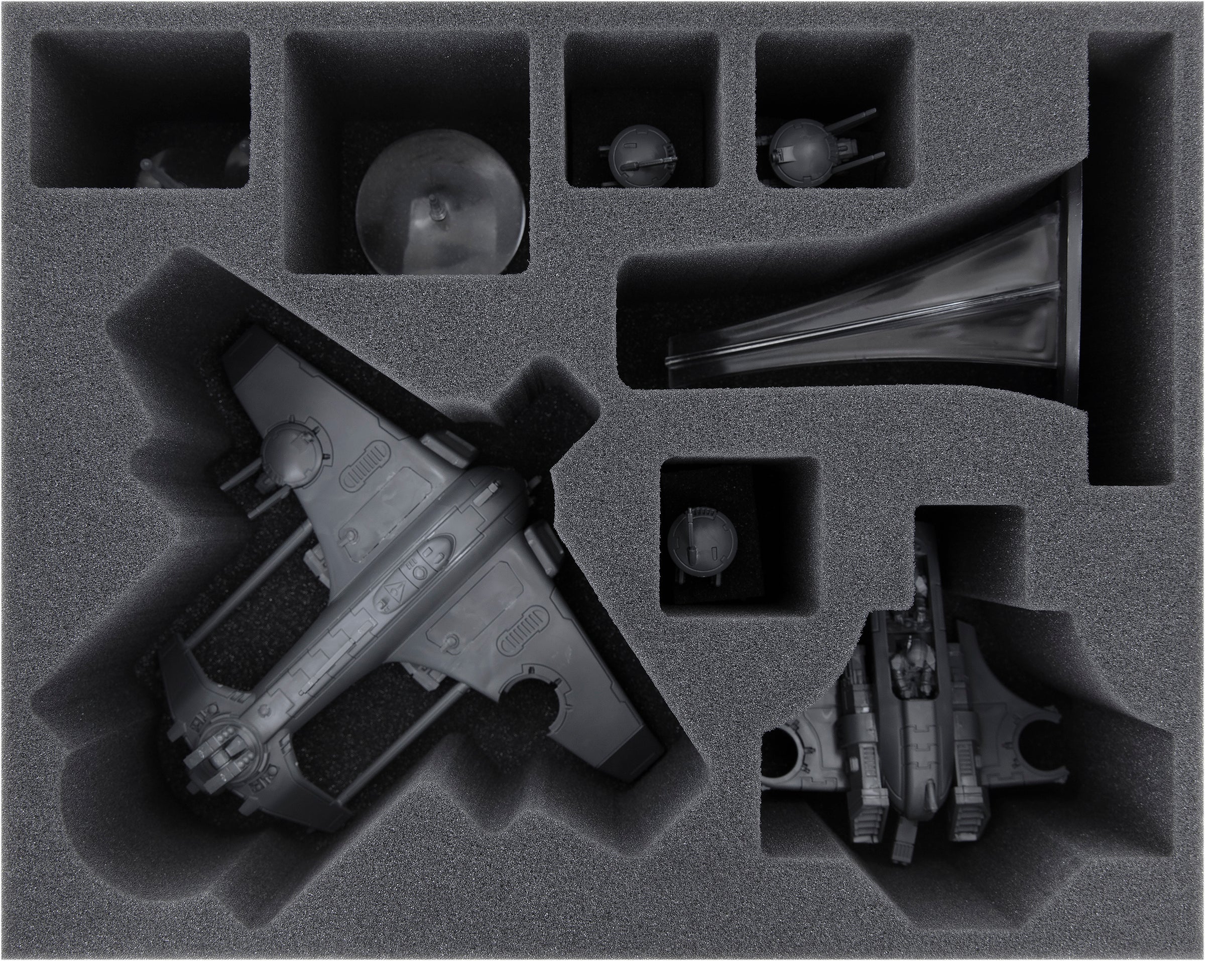 - 1 Full-Size foam tray for T’au Empire: AX3 Razorshark Strike Fighter / AX39 Sun Shark Bomber + TX4 Piranha (FSMFDB105BO)