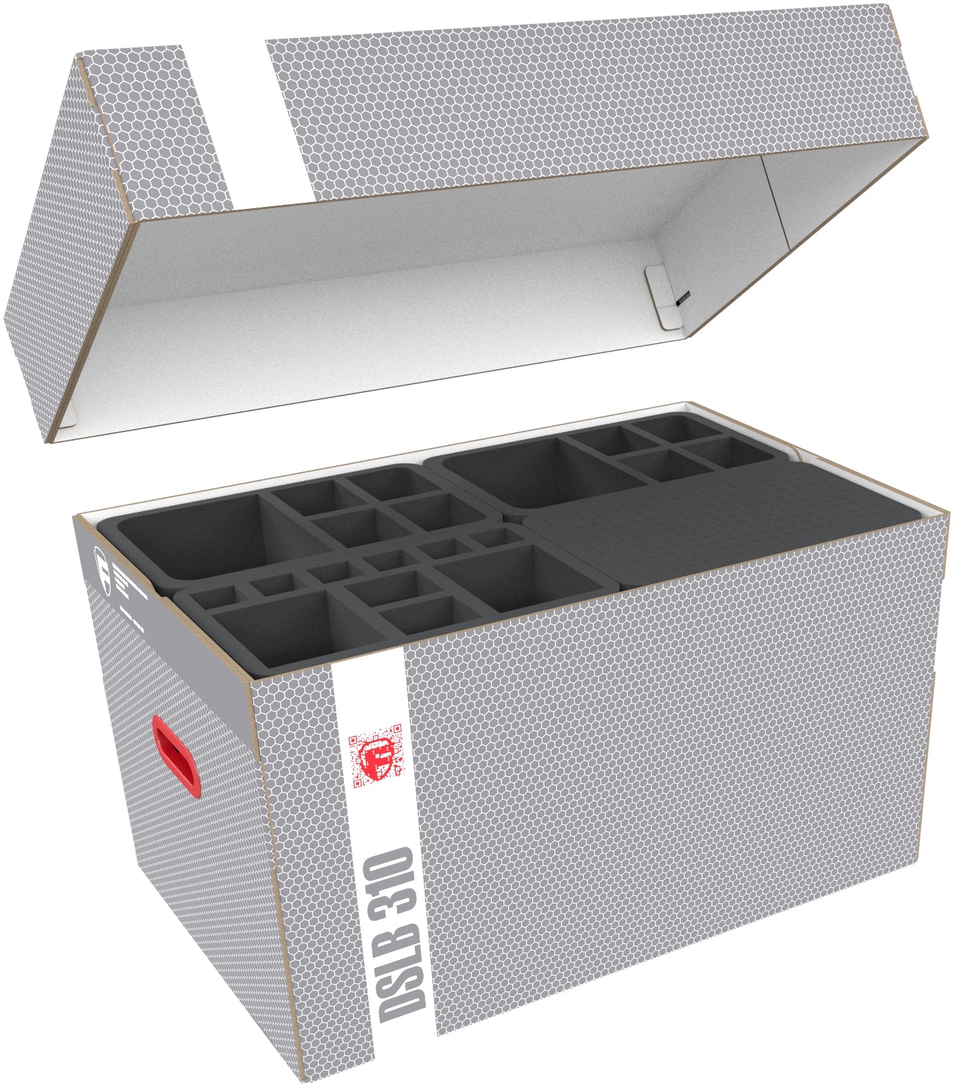 The Storage Box DSLB310 is made of coated, corrugated cardboard. This makes it not only pleasantly light, but also very tear-resistant and stable. The attachable lid reliably protects the contents from dust and other external influences. With the appropriate foam trays, miniatures, game material, and all other goods can be stored safely — and conveniently transported with the two plastic-reinforced carrying handles on the sides.