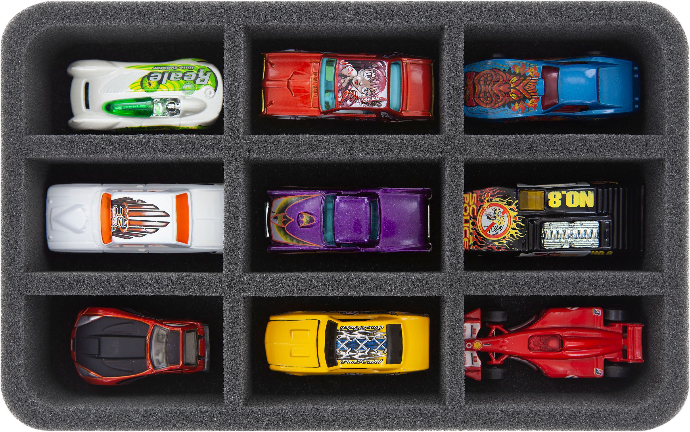 The foam trays feature nine compartments each and allow you to store models of different heights. The fine-pored foam provides optimal protection against damage – paint remains free from scratches, sensitive parts like e. g. mirrors remain intact.