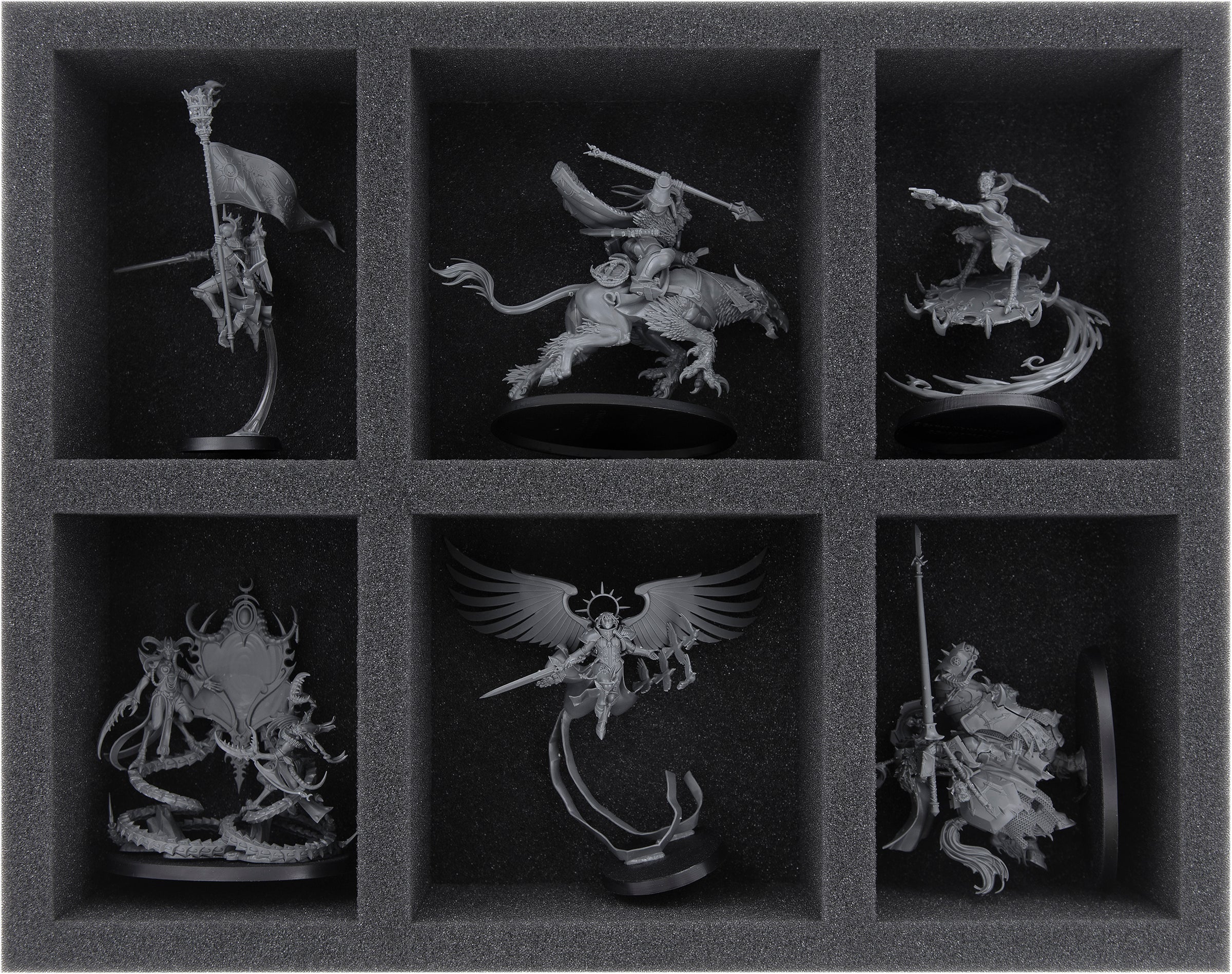 - 1 Full-Size foam tray with 6 compartments for larger miniatures like Celestine, the Living Saint, Zephyrim Squad and models with similar dimensions (FS060A010)