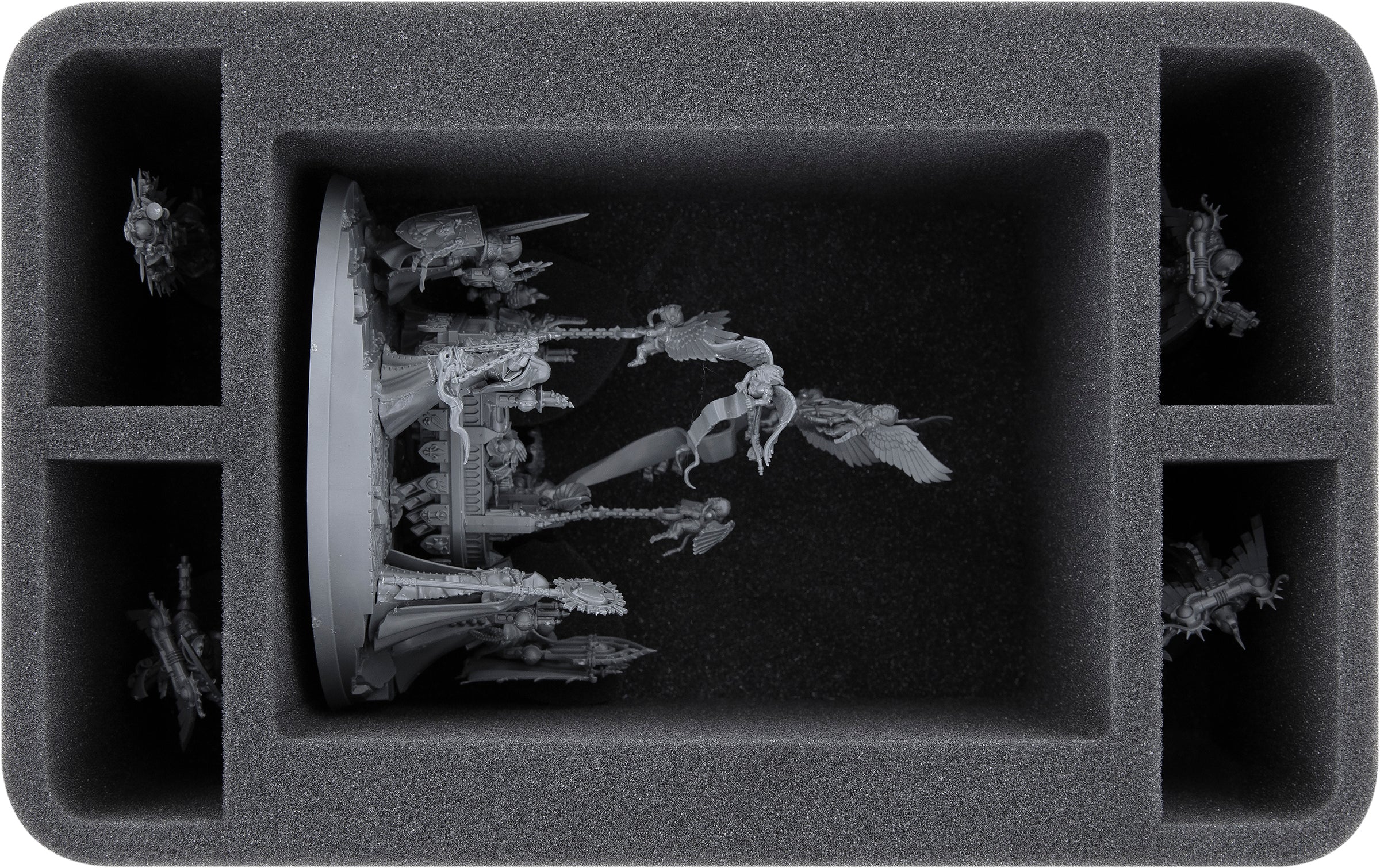 - 1 Half-Size foam tray with 5 compartments for 1 Triumph of Saint Katherine and additional infantry-models from the Adepta Sororitas on 32 mm base like Canoness Veridyan, Ephrael Stern & Kyganil or an Imagifier