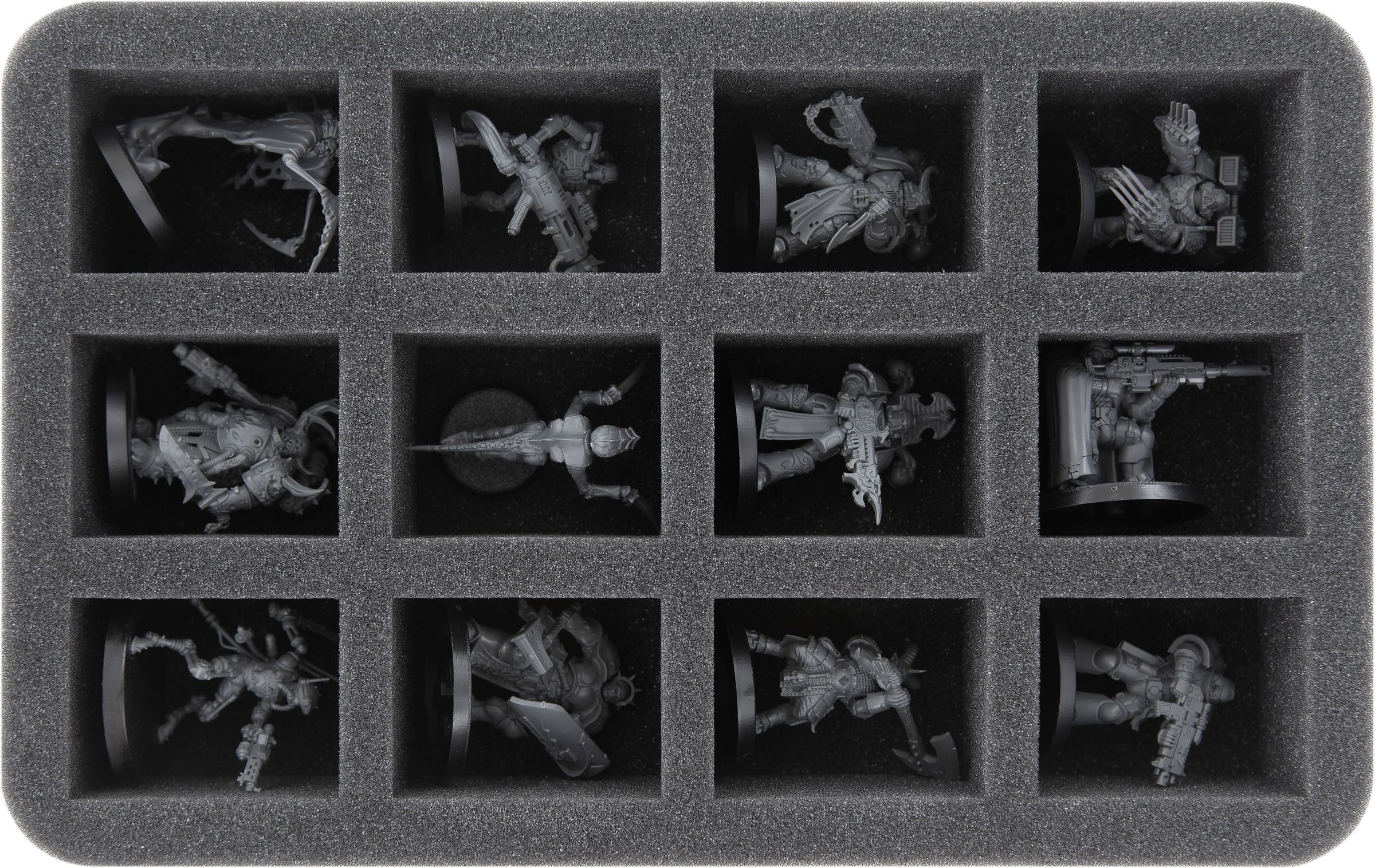 - 1 foam tray with 12 compartments for standard miniatures (HS050I012BO)