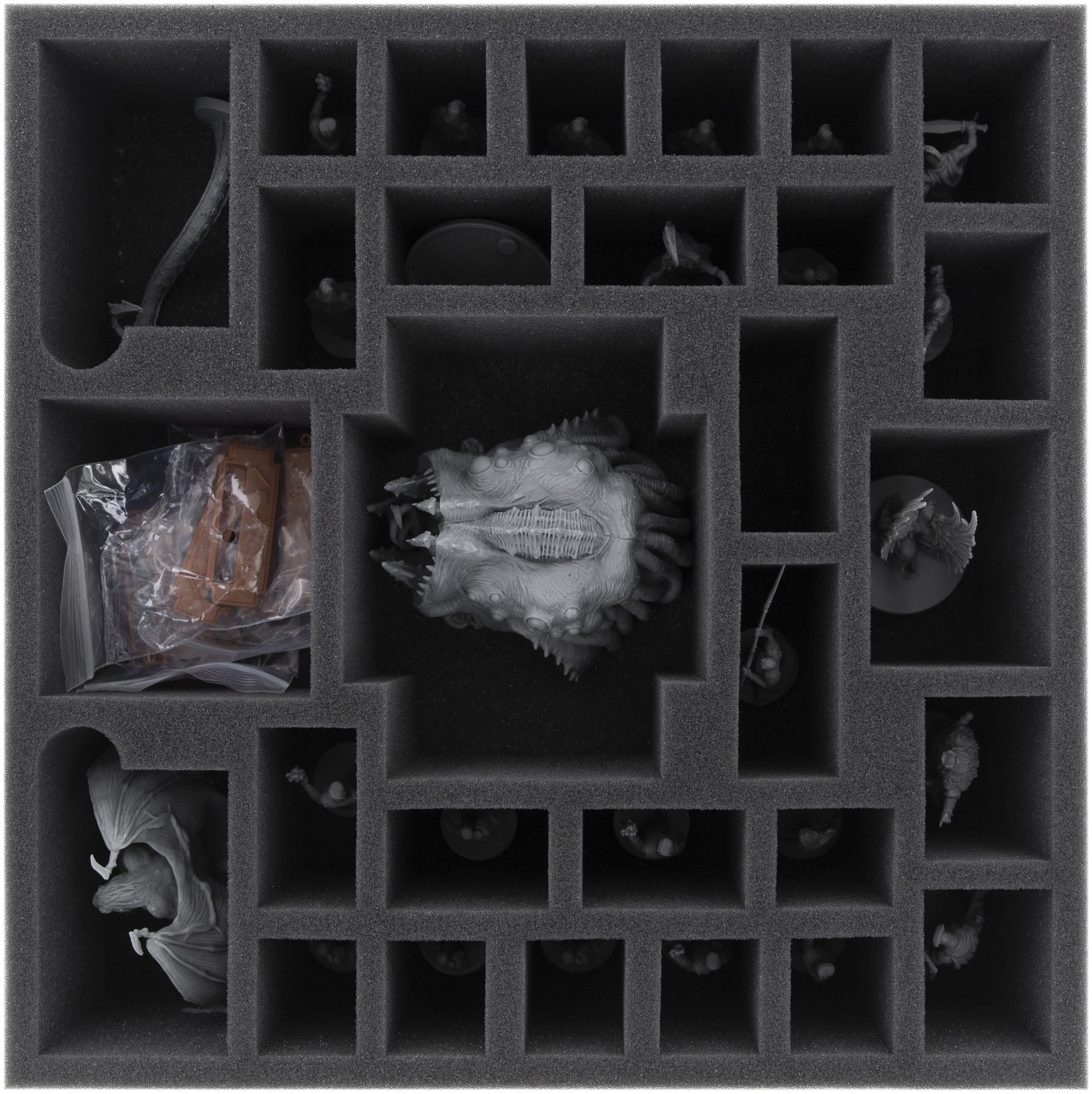 The foam tray for Mythic Battles: Pantheon 4 Expansions allows you to store all miniatures of the Trojan Wars, Keto, Oedipus vs The Sphinx and the Corinthia expansions. The foam tray features 29 custom-cut compartments which safely accommodate the 27 miniatures from the four expansions. In the additional 2 compartments, further game components like Stat Clips can be stored.