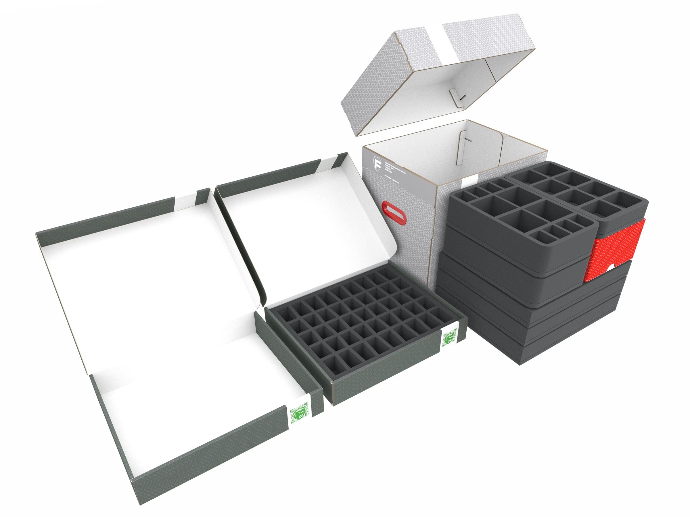 Because with this customized Feldherr Storage Box bundle including custom foam inserts and a game cards deck box, all miniatures, playing cards and accessories from the “Gameplay All-In Pledge” are under your control.