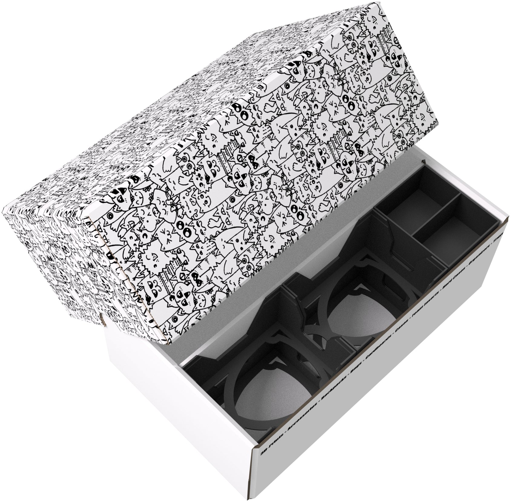 The Storage Box consists of two parts, a box, and a lid. Both parts are made of coated cardboard. A partition in the middle of the box divides it into two equally sized compartments. The slip-on cover protects the cards from dust and other external influences.