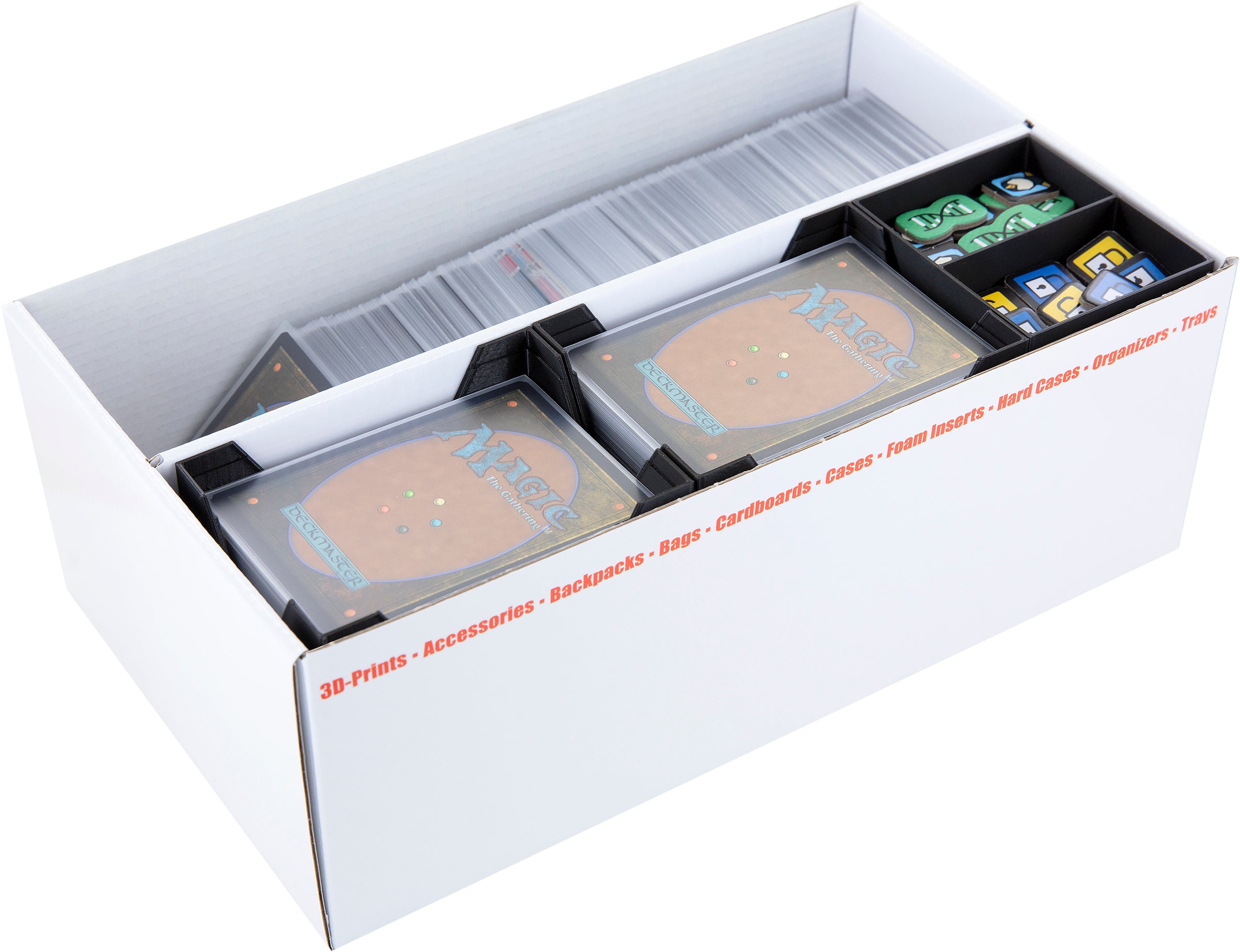 The Storage Box is the ideal addition to your collection and offers plenty of storage space for your cards. Up to 560 cards in 64 x 89 mm format can be stored in the four card holders, while you can store up to 800 additional cards in the second compartment of the Storage Box. Three token holders take care of your small game material. So you have a large part of your collection always with you and can concentrate fully on playing!