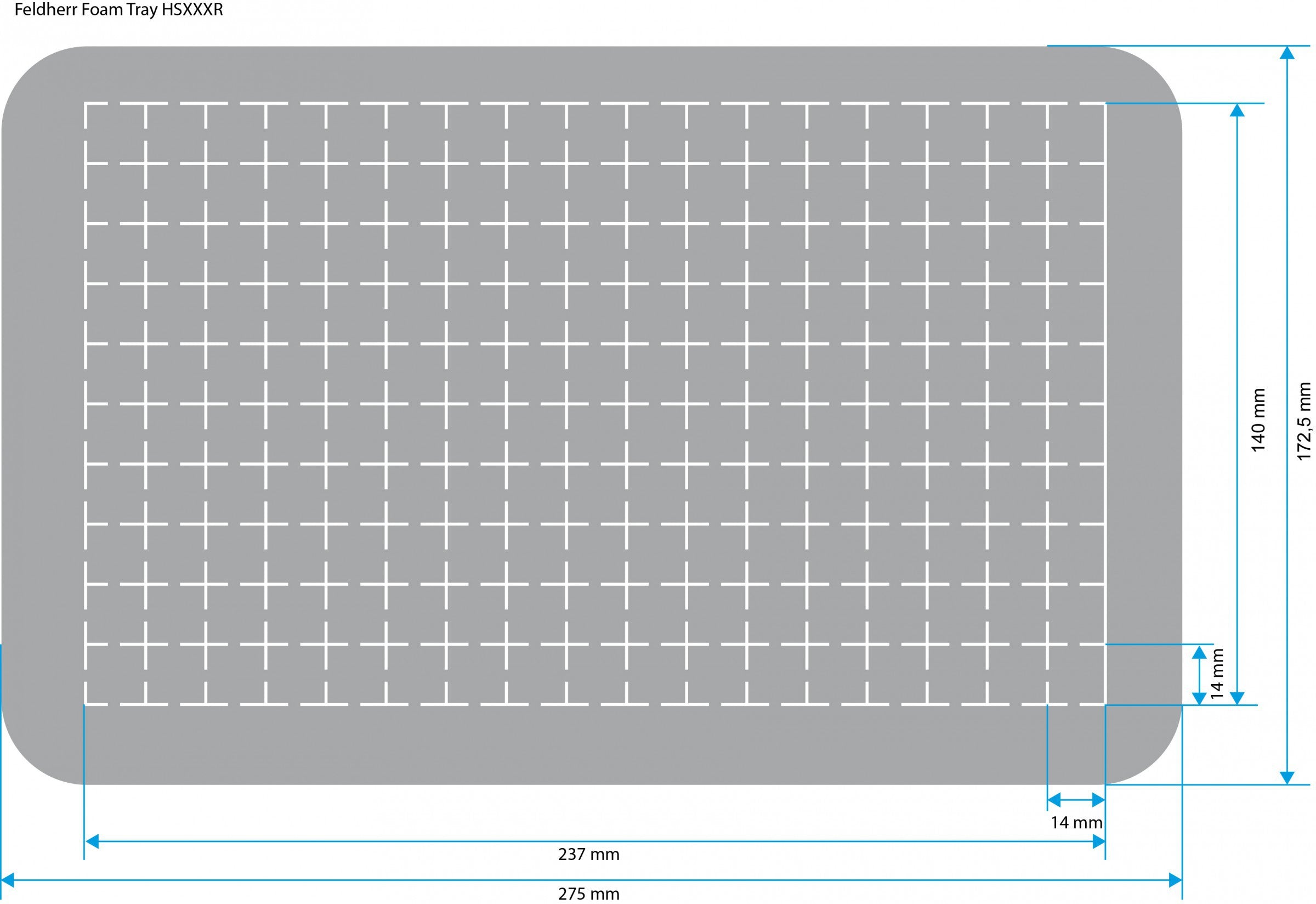 - Dimension of the Feldherr half-size (HS) foam tray: 275 mm x 172 mm x 60 mm height