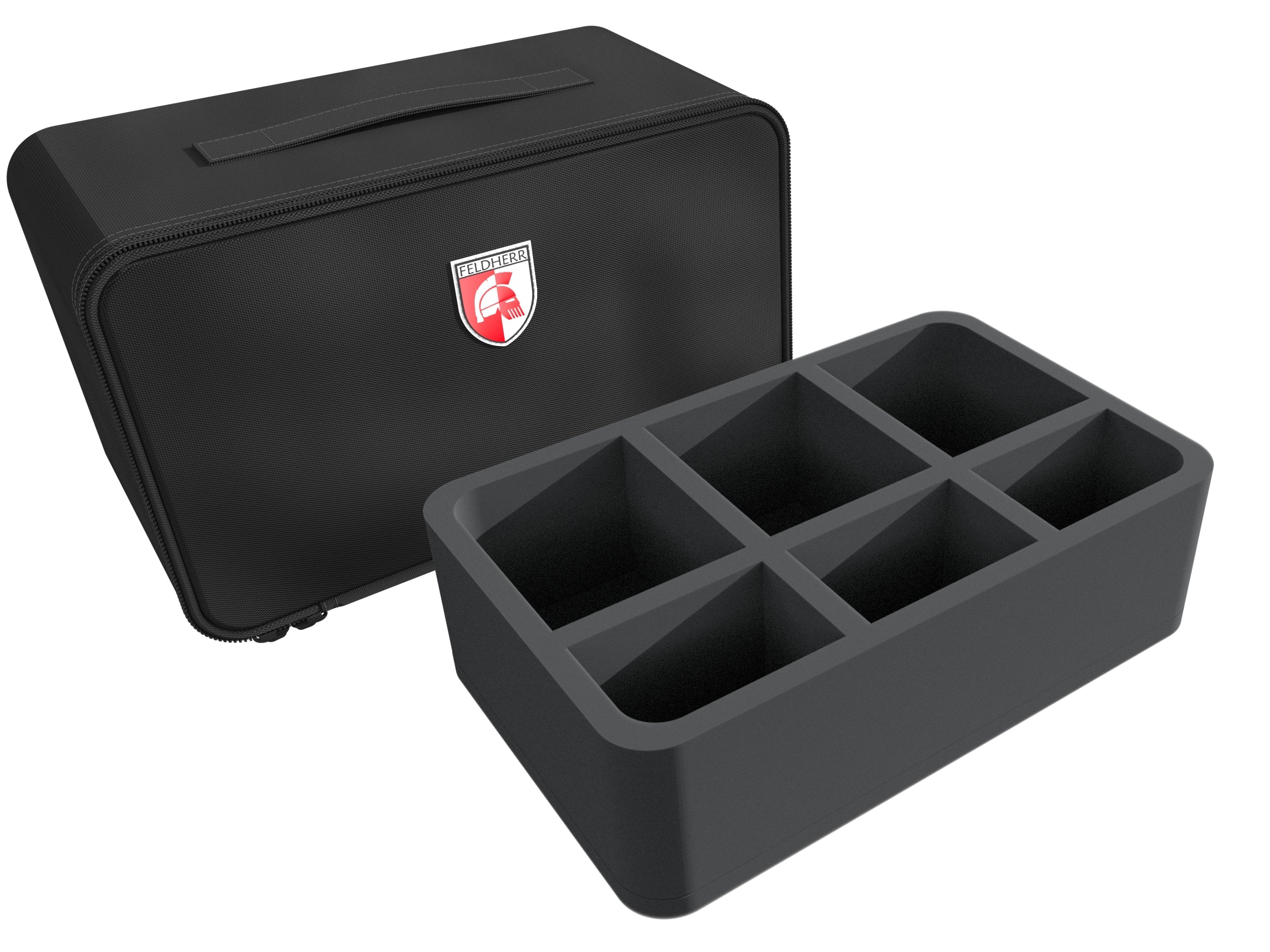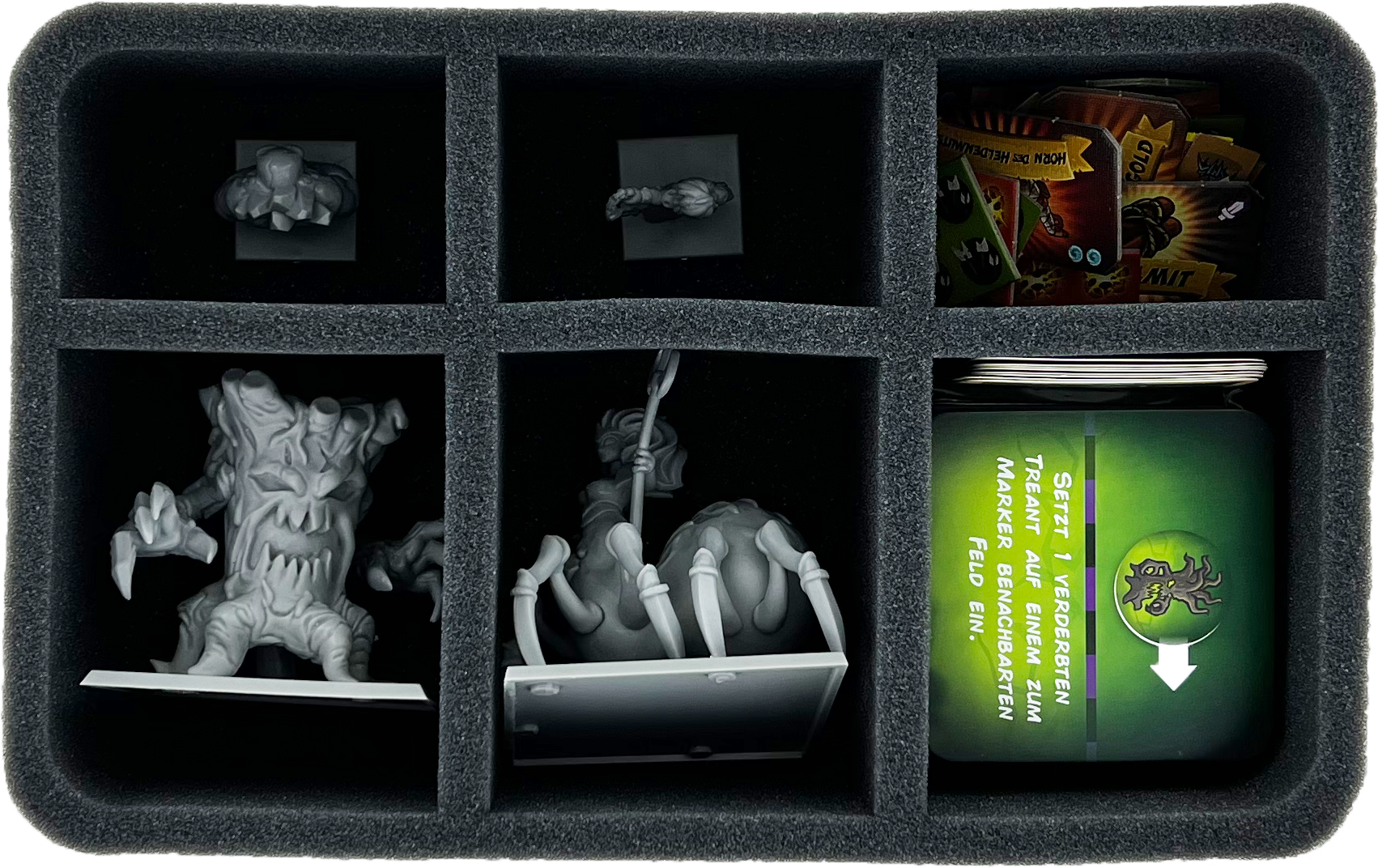A Half-Size foam tray with 6 compartments takes care of your miniatures, tokens, and square cards.