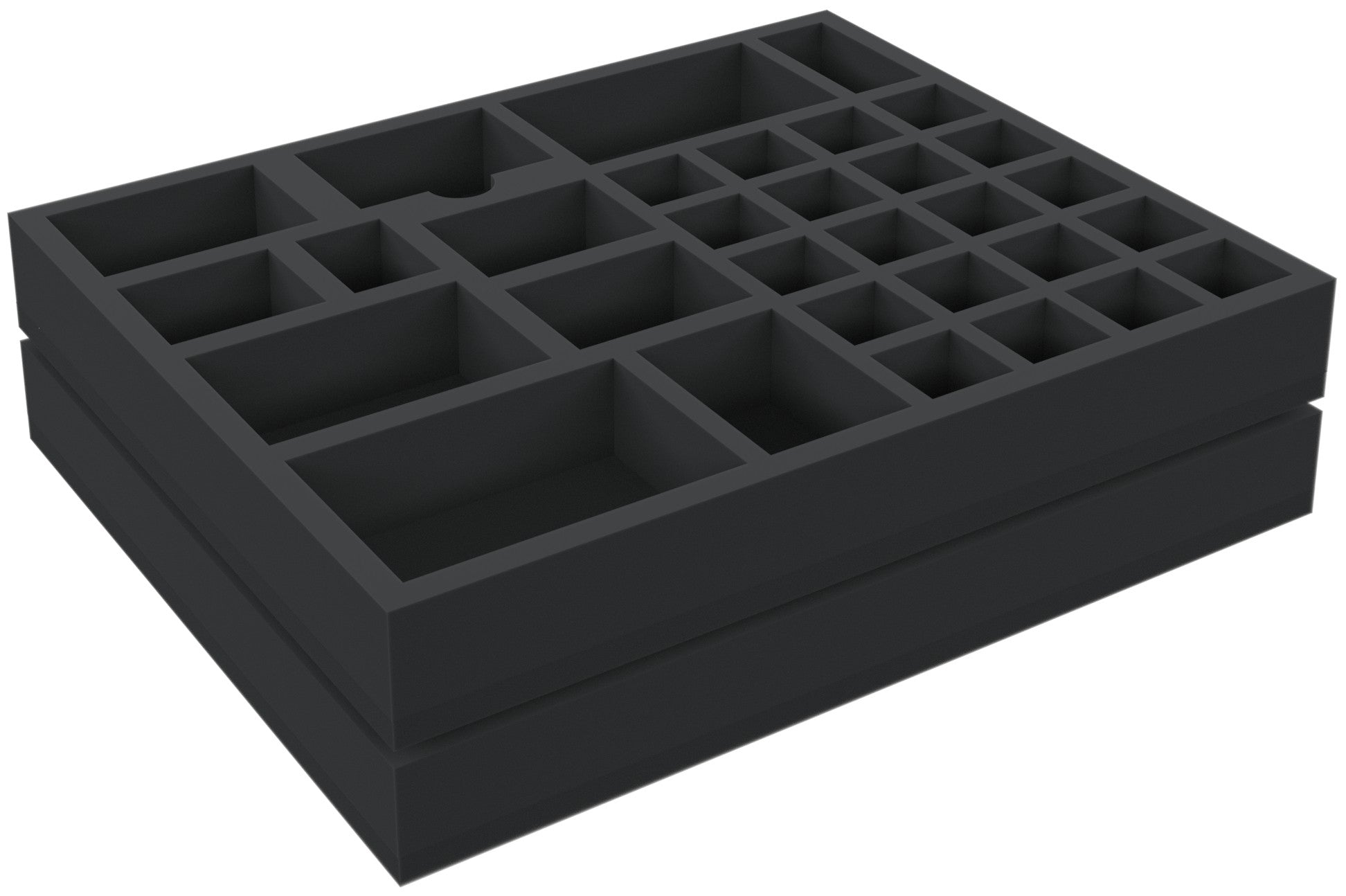 Protective foam tray for the original board game box of the Scythe core game. Foam tray provides a great solution for protecting all figures and tokens from the original board game box. For optimal protection there is an additional 10 mm foam topper included.