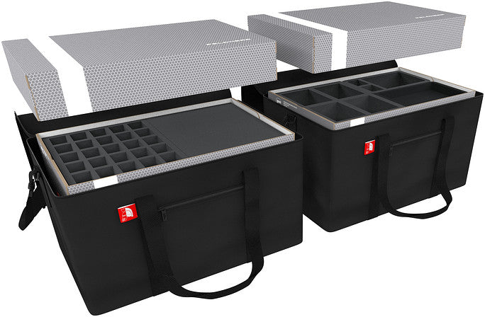 To tackle the vast scale of the All-in Pledge, we filled two Double-Size Storage Boxes with a plethora of foam inserts for your miniatures and dedicated card boxes for your game cards and other materials. All of these are expertly packed inside the Transporter bags for secure transportation.