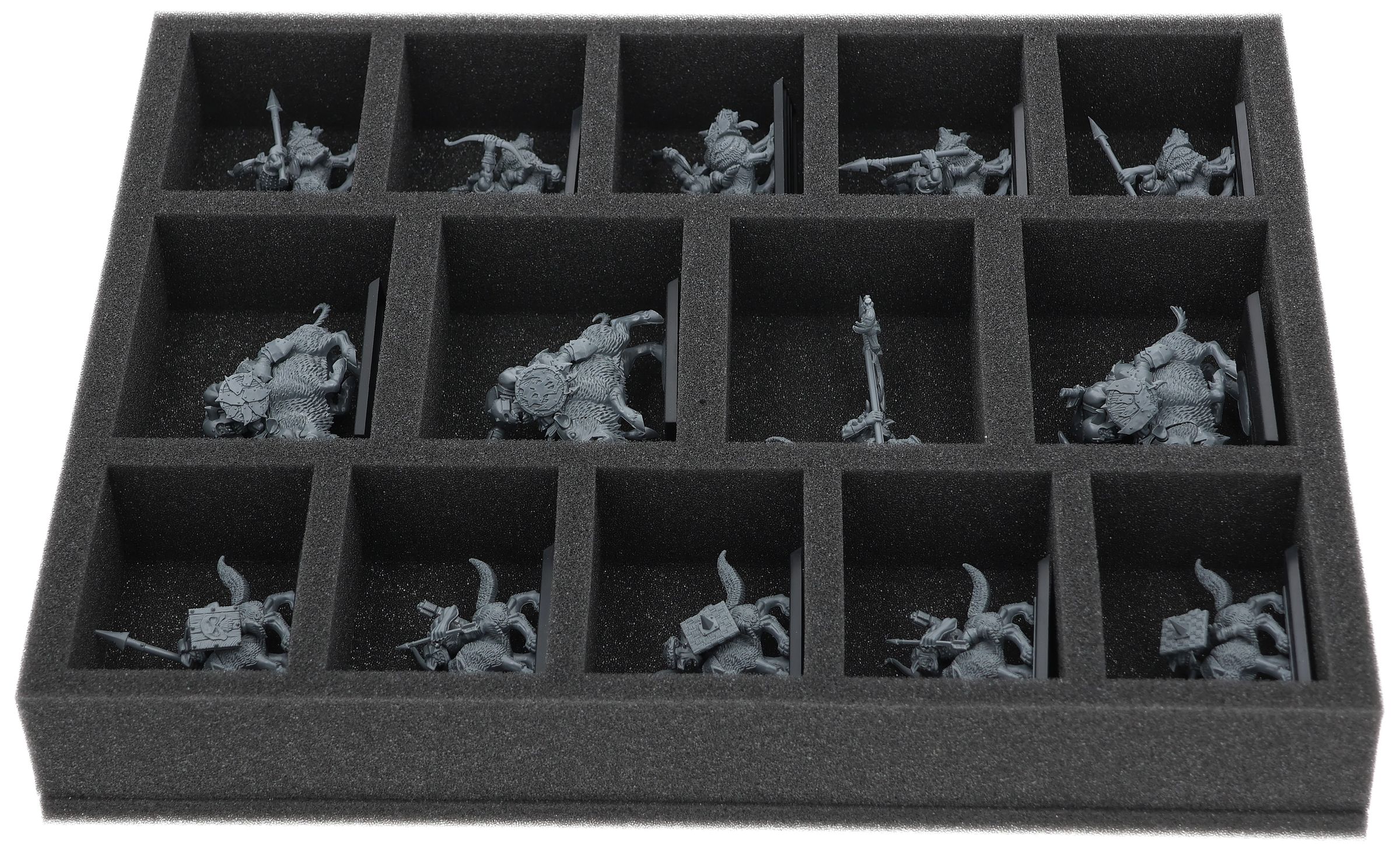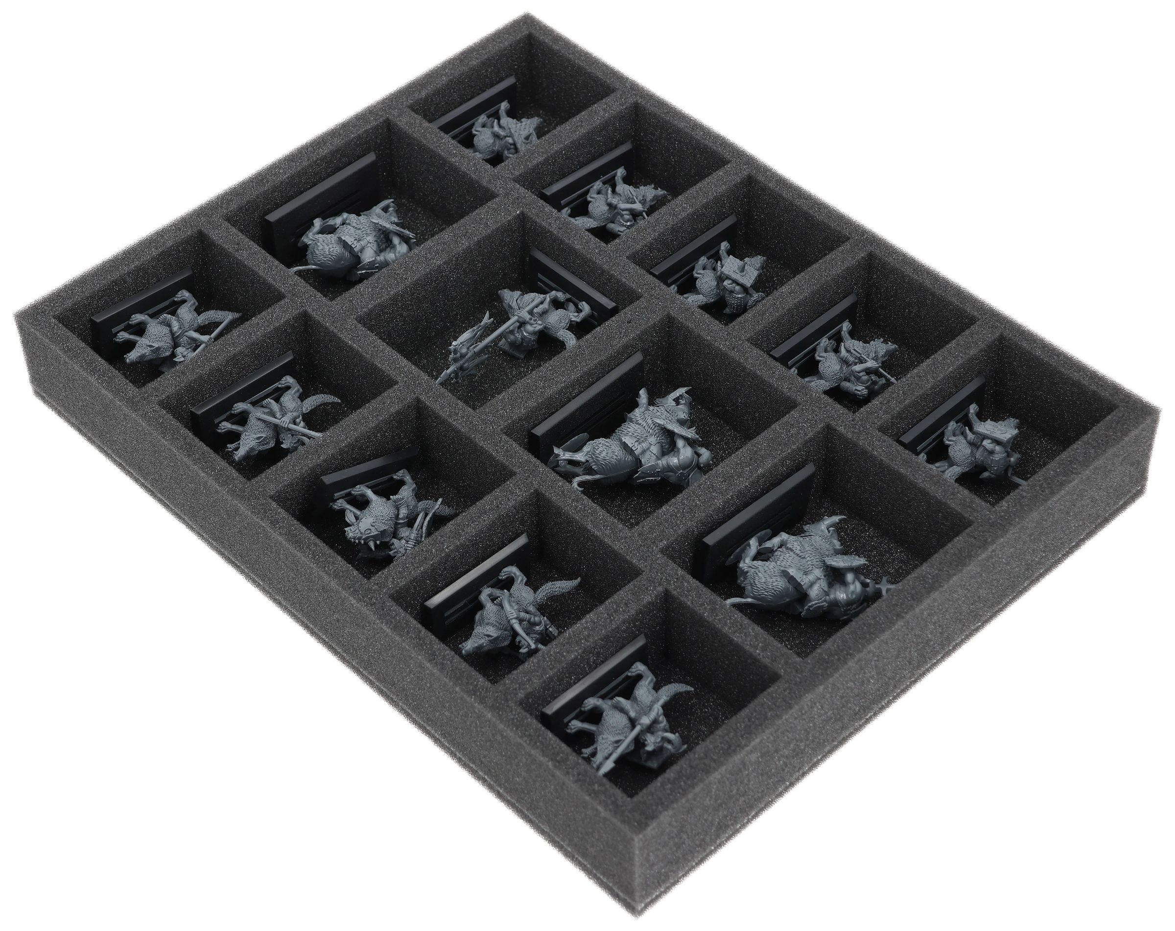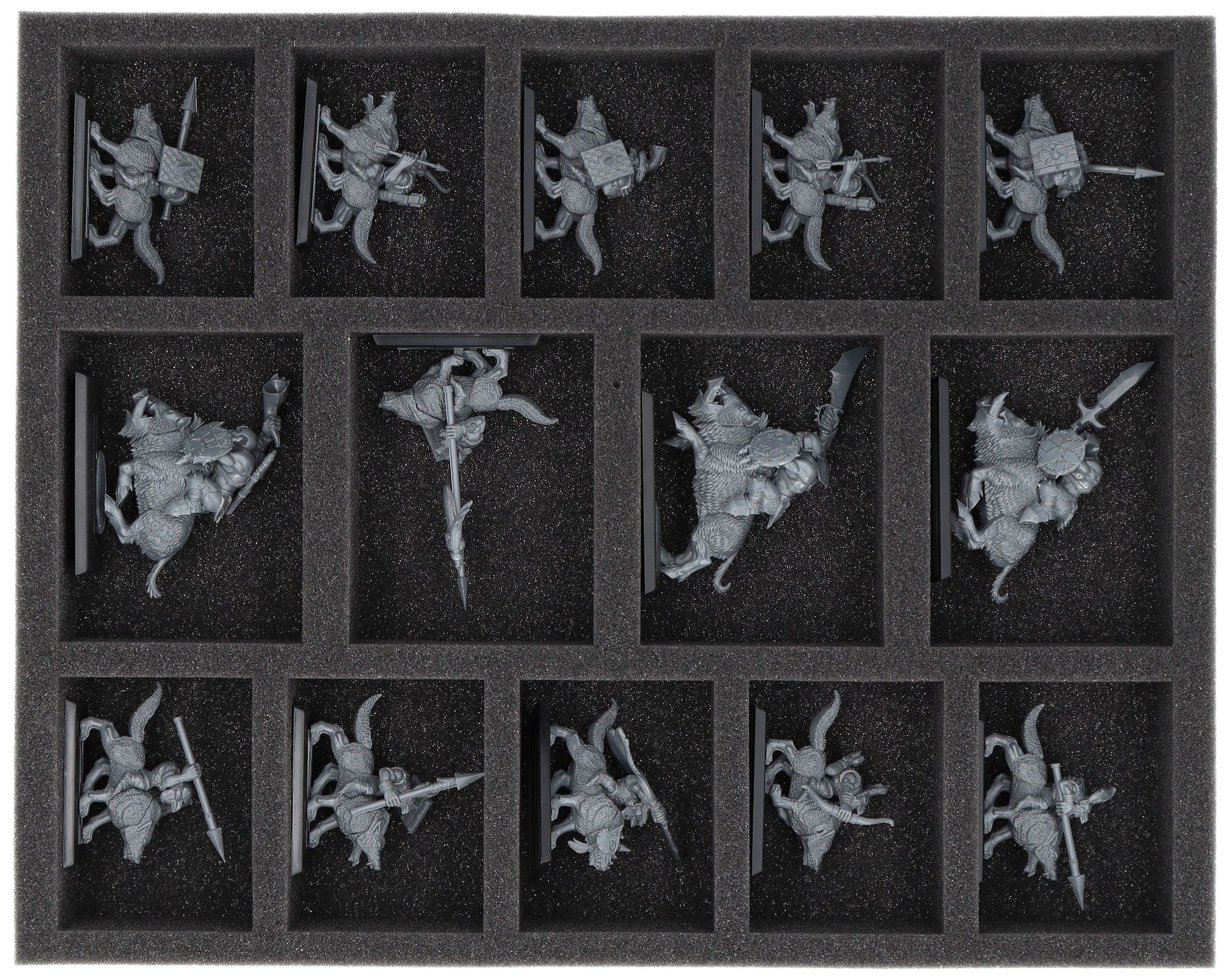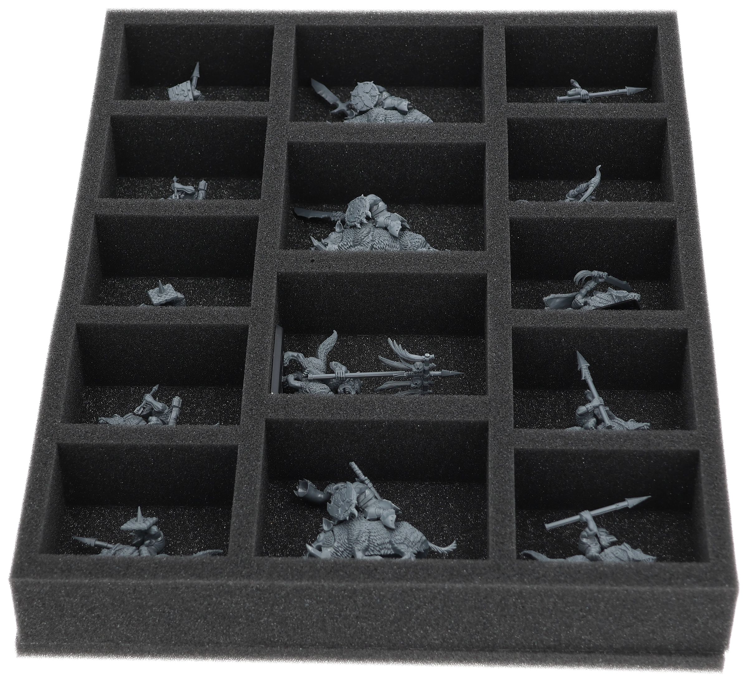On this Feldherr foam tray you have space for up to 14 miniatures of your army. The insert is especially suitable for storing the Orc Boar Boyz Mob, Goblin Wolf Rider Mob and similar sized models.