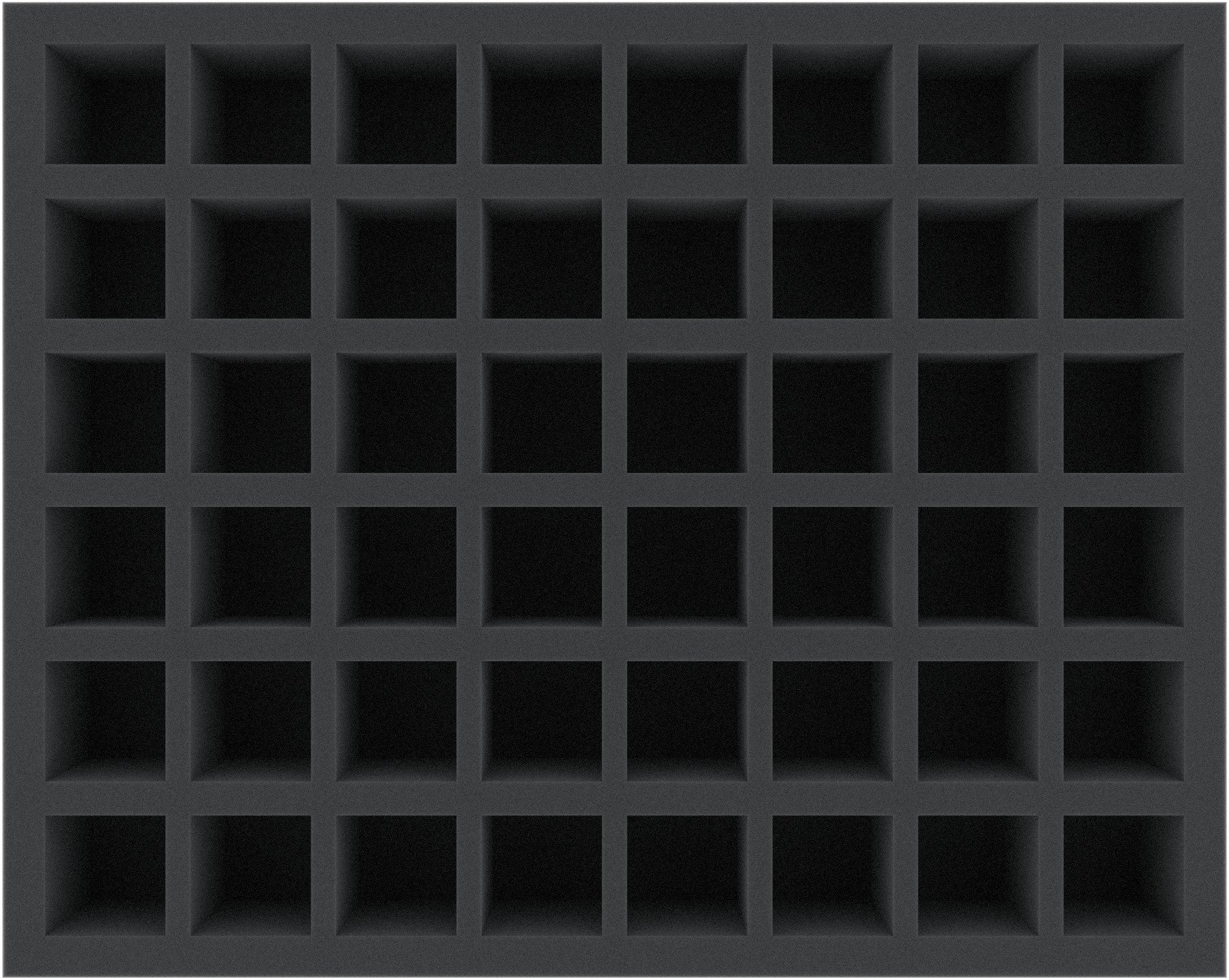 Perfect ready to use foam tray with 48 square compartments for all minis on 25 mm or 30 mm bases. It can also be used to transport Citadel paint pots of 12 ml size.