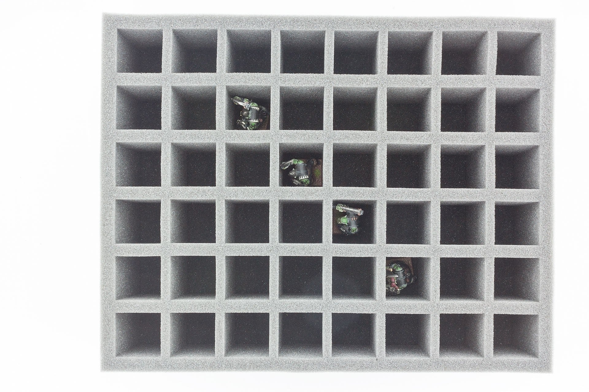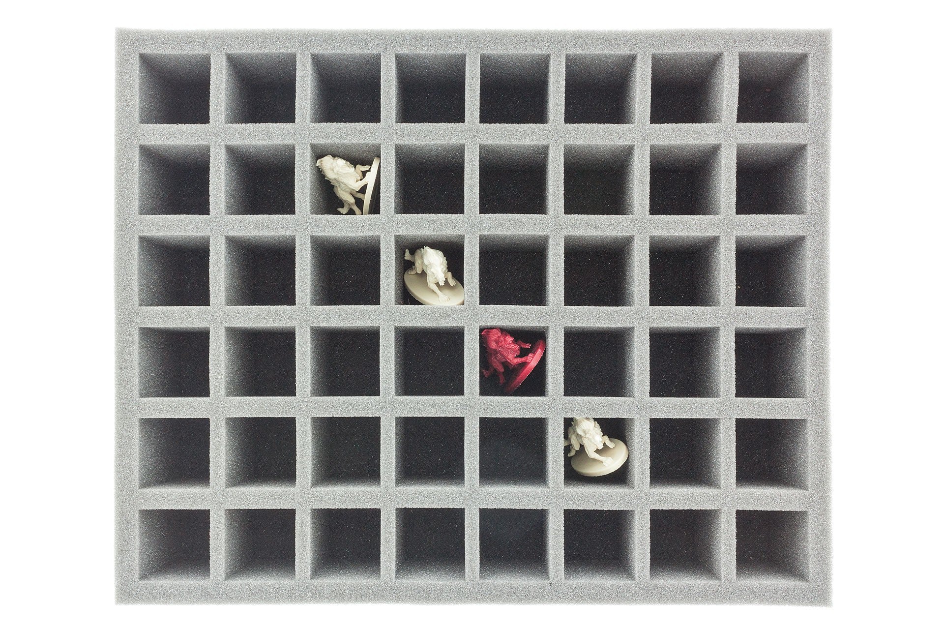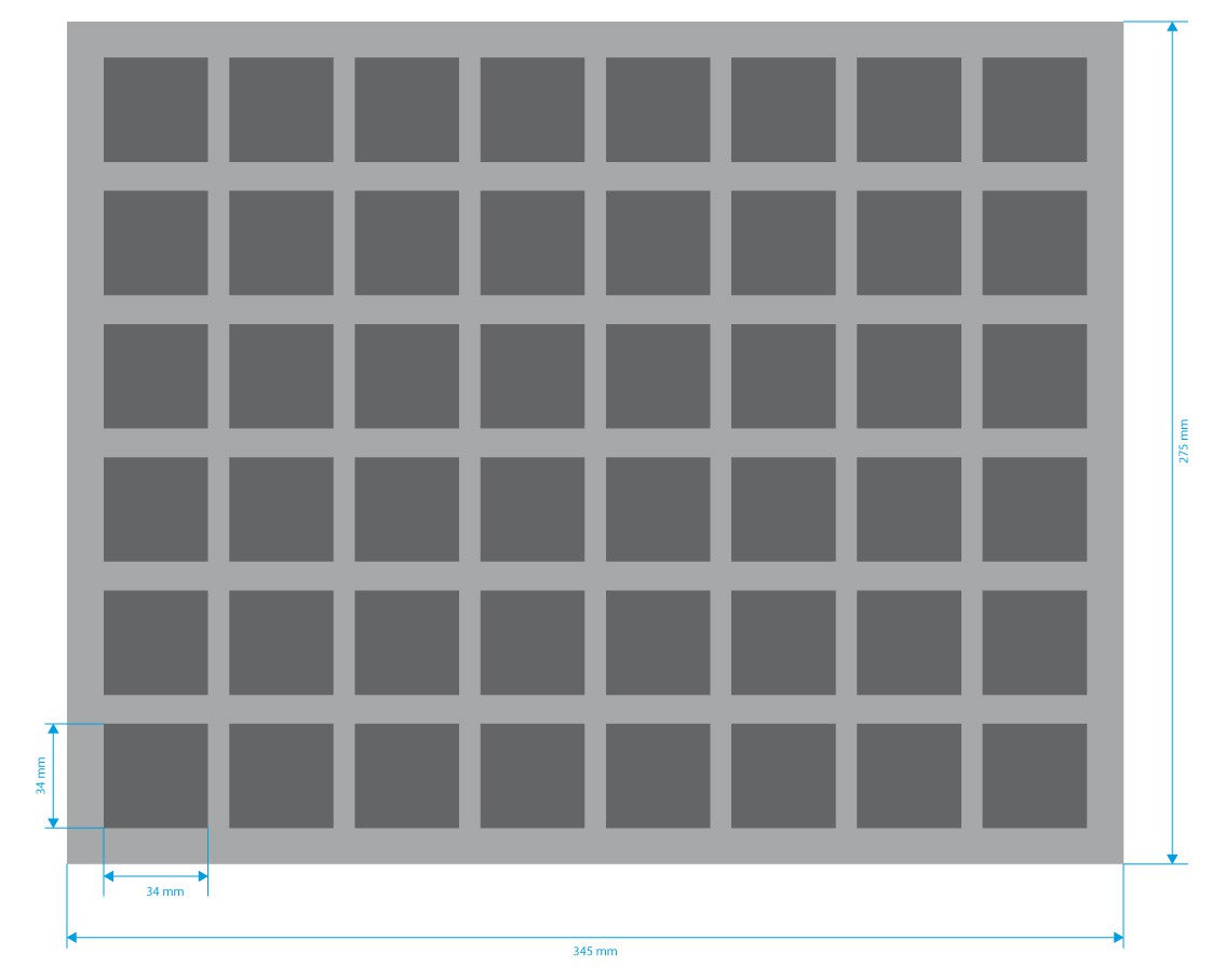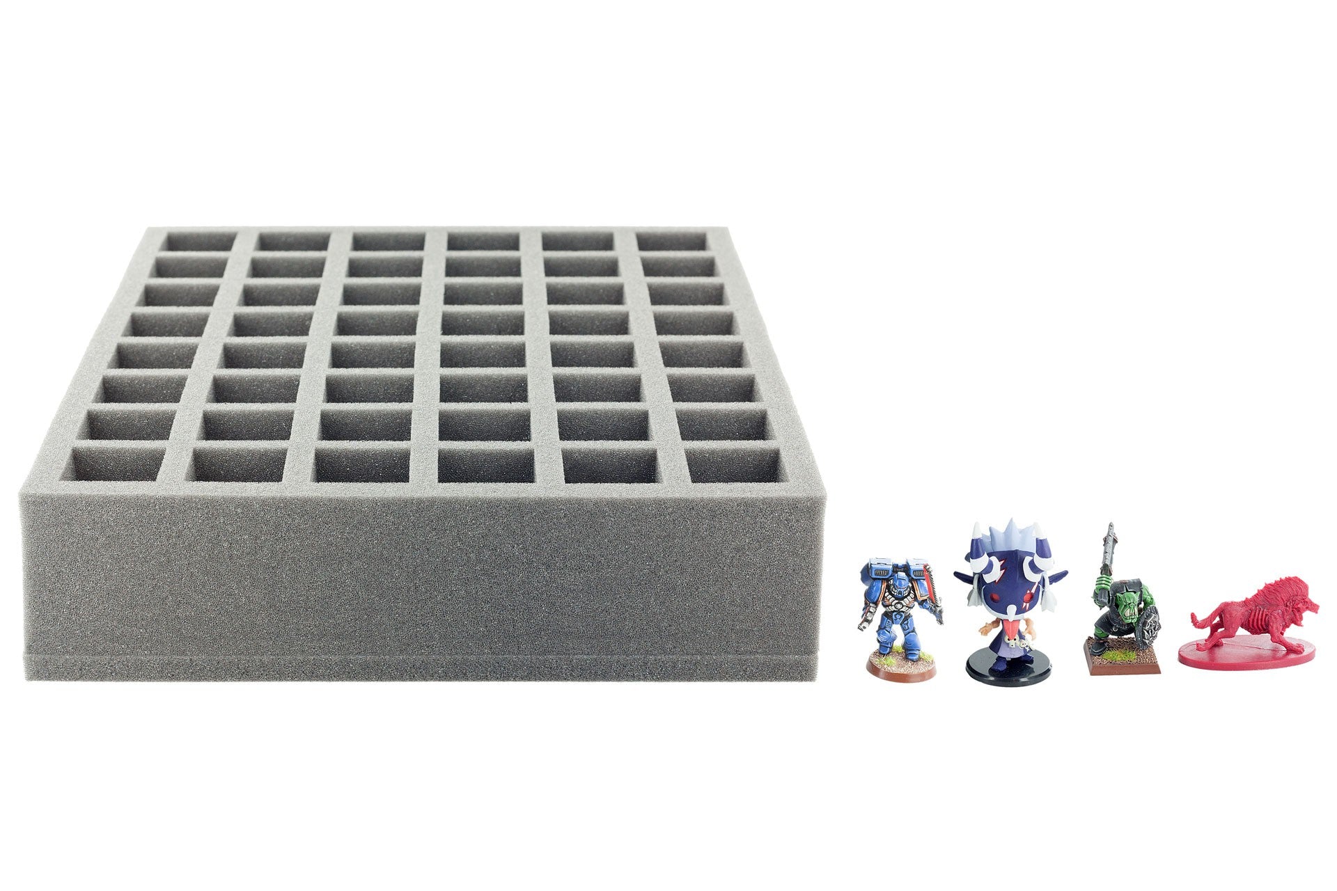 Vassoio in schiuma pronto all'uso con 48 scomparti quadratici (34 mm x 34 mm x 60 mm di altezza) per tutti i minis con base fino a 30 mm di diametro / lunghezza laterale. Questo vassoio in schiuma si adatta anche ai colori della cittadella GamesWorkshop Colors Paint Pots, Vallejo Model Paints o Army Painter Warpaints.