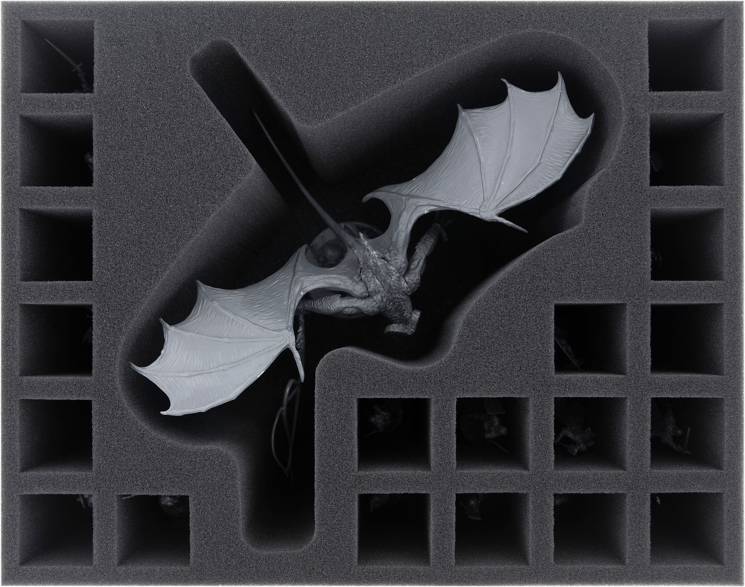 In the large compartment the Balrog is accommodated. Due to the miniature-precise cut, the demon stays in place even during transport. Securely wrapped all around in soft foam, the filigree parts of the figure, such as wings, claws and flaming whip, are optimally protected from storage and transport damages. Also it prevents a scratching or rubbing of the colors of the painted miniature.