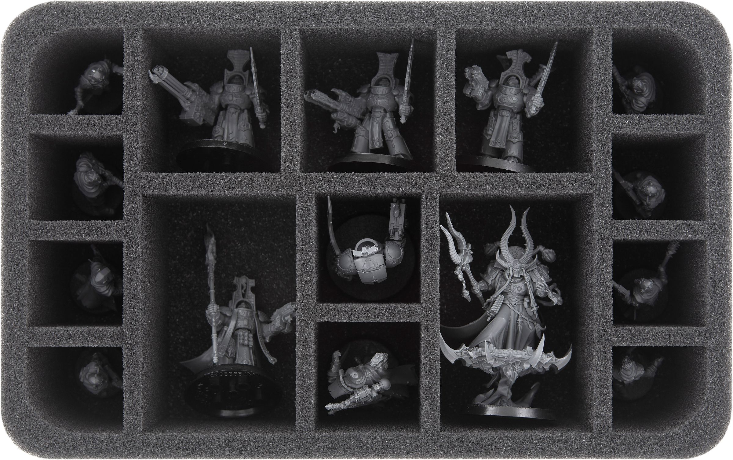 This Half-Size foam tray can safely hold up to 15 warriors of the XV. Legion. The different sized compartments are suitable for standard warrior models as well as for larger models of the Thousand Sons.