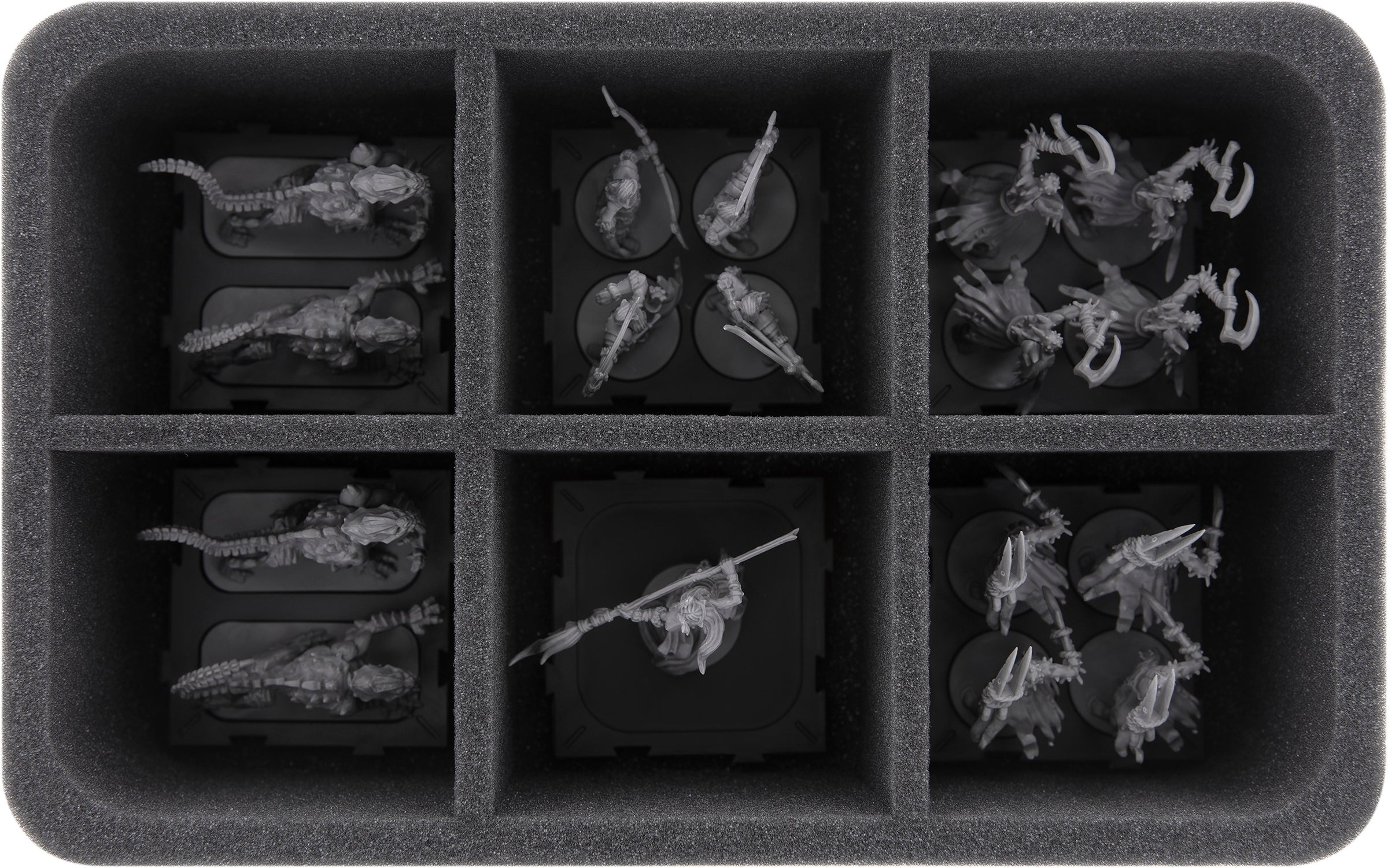 The 6 equally sized compartments of this Half-Size foam tray hold your units on their movement trays safely and neatly. The soft foam not only protects the sensitive details such as swords and claws from damage, but also the colors of the painted miniatures are protected from scratches and abrasion.