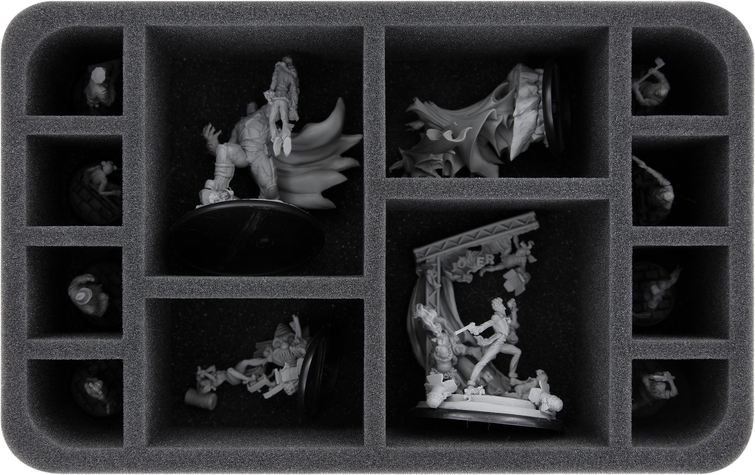 The two large compartments are ideal for character figures on 60 mm bases, such as the Joker or Bane the Bat, while the mid-sized compartments can hold 40 mm base miniatures (e.g. Batman, Harley Quinn) or bulky models on 30 mm bases.