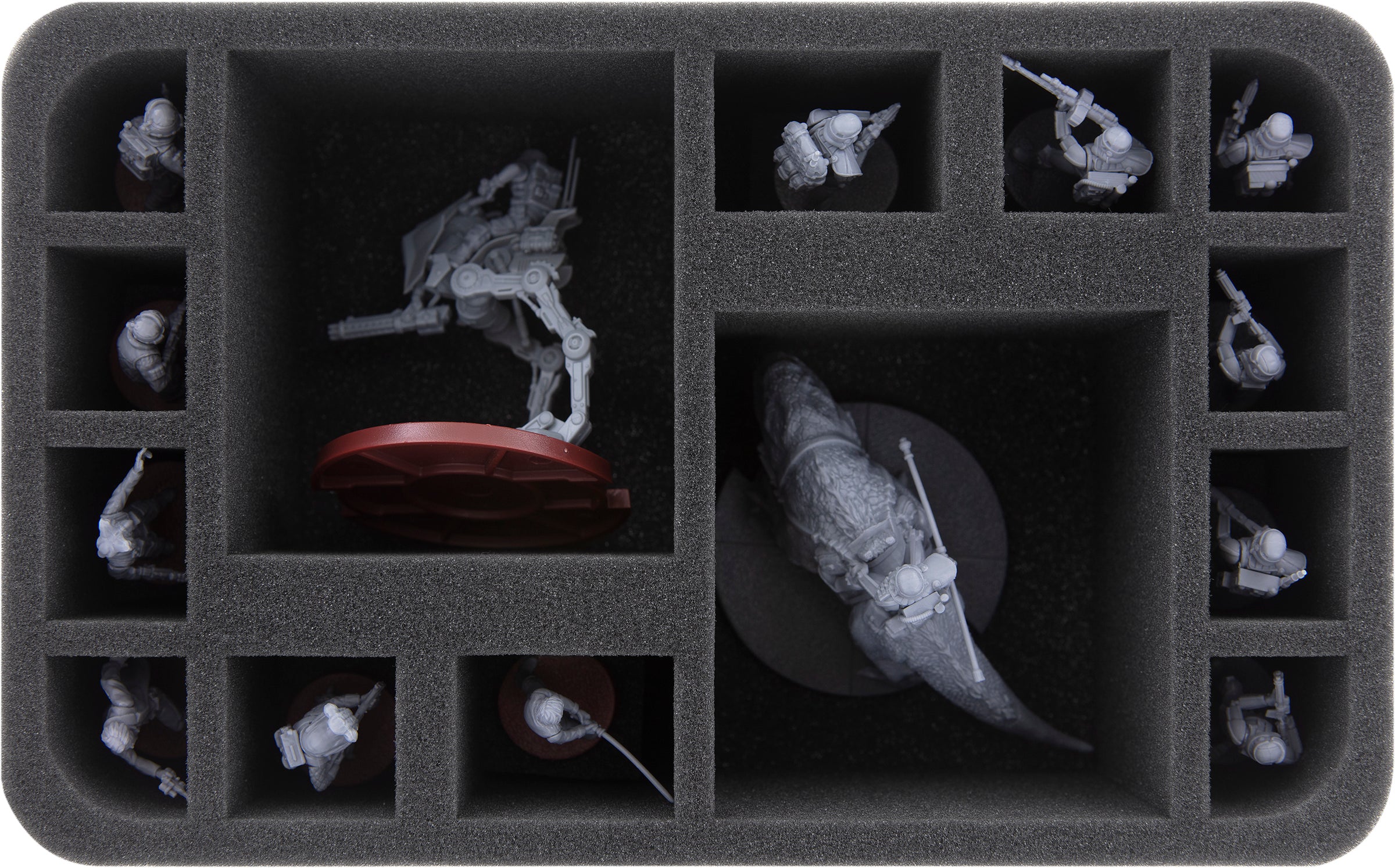 Up to 14 Star Wars: Legion miniatures can be stored neatly and securely on this Half-Size foam tray. The two large compartments are ideal for the Dewback Riders and other similarly large figures. The remaining 12 compartments can be filled with troopers and other infantry models, or can also be used to store accessories (e.g. tokens and dice).