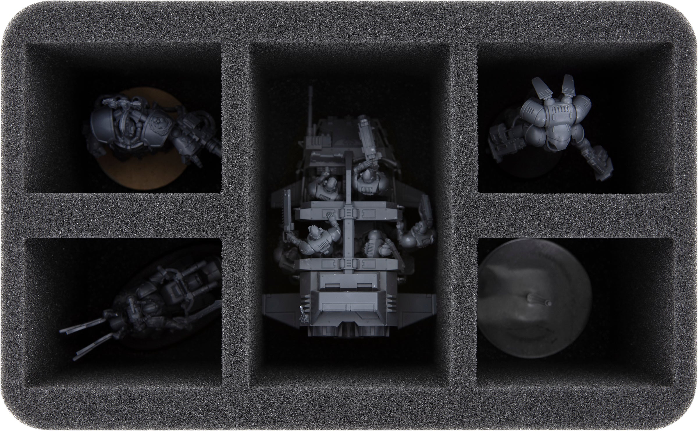 One model of the Land Speeder Storm fits on its flying base exactly into the large compartment in the middle. The exact fit ensures that sensitive parts such as the heavy bolter, the antenna, and of course the Space Marines arrive undamaged and ready for action at the tabletop.