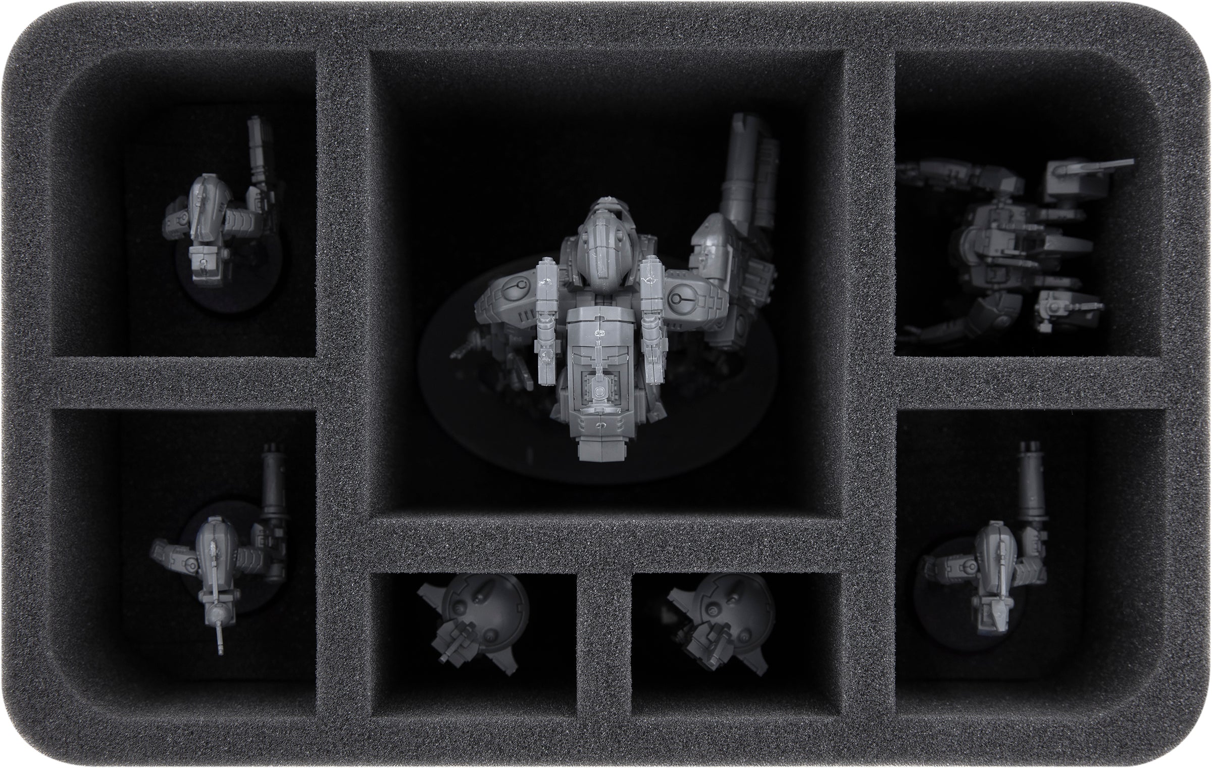 To make sure that the Battlesuit arrives at the gaming table without losing the numerous weapons or drones on the way, we have this Feldherr Half-Size foam tray for you to protect your miniature.