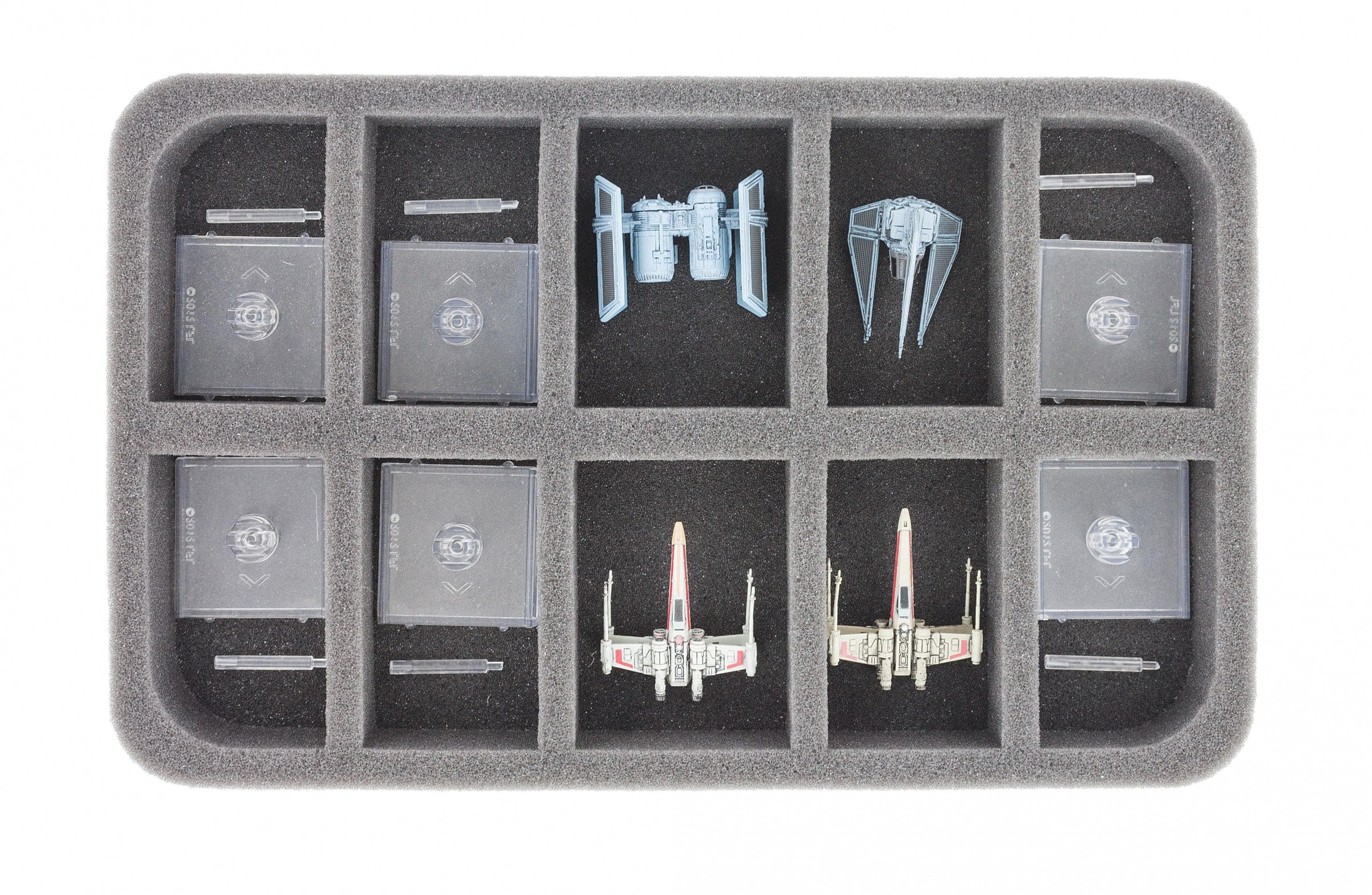 Feldherr Half-Size Vassoio per schuma per un massimo di 10 modelli di navi Star Wars X-Wing. Adatto per il trasporto di navi stellari senza base. Se volete trasportare le vostre astronavi con base di volo inclusa, vi consigliamo ad esempio l'HSBE050BO.