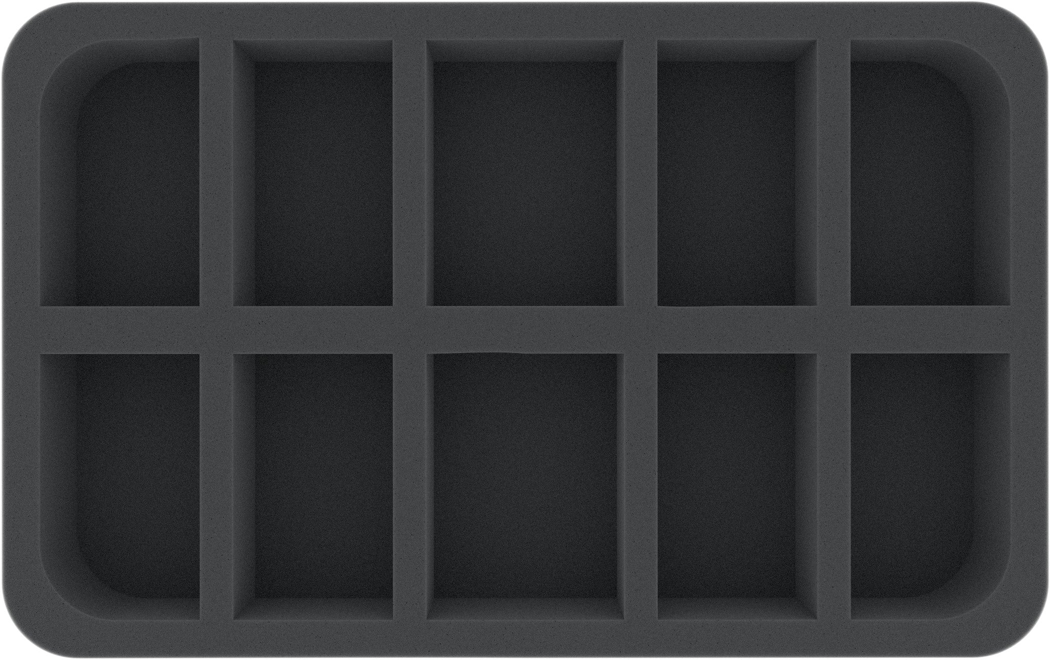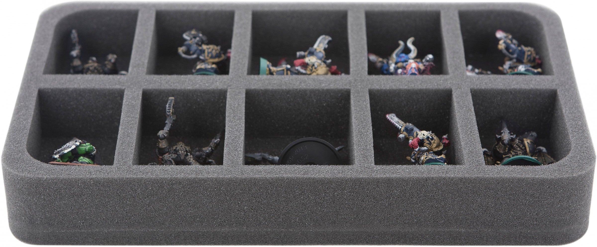 This foam tray has 10 compartments for the safe and orderly storage of wider tabletop miniatures and accessories like dice or tokens. The fine-pored foam offers optimal protection against damage.