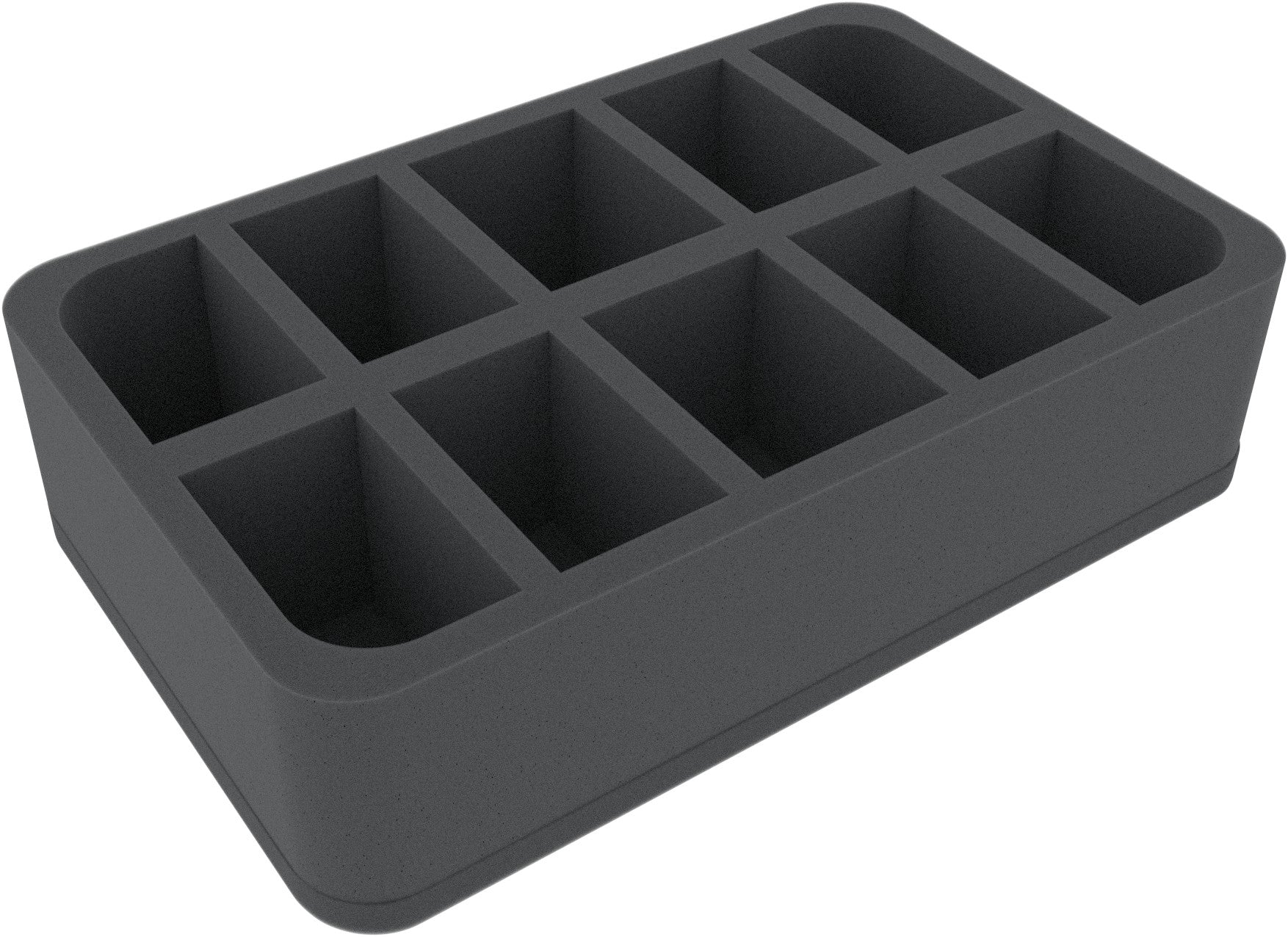This Half-Size foam tray is divided into 10 compartments of different sizes. It is particularly suitable for the safe storage of miniatures and game material, such as tokens, cards or dice, from various board games and tabletop systems. Of course, other valuable small parts can also be stowed here neatly and well protected.