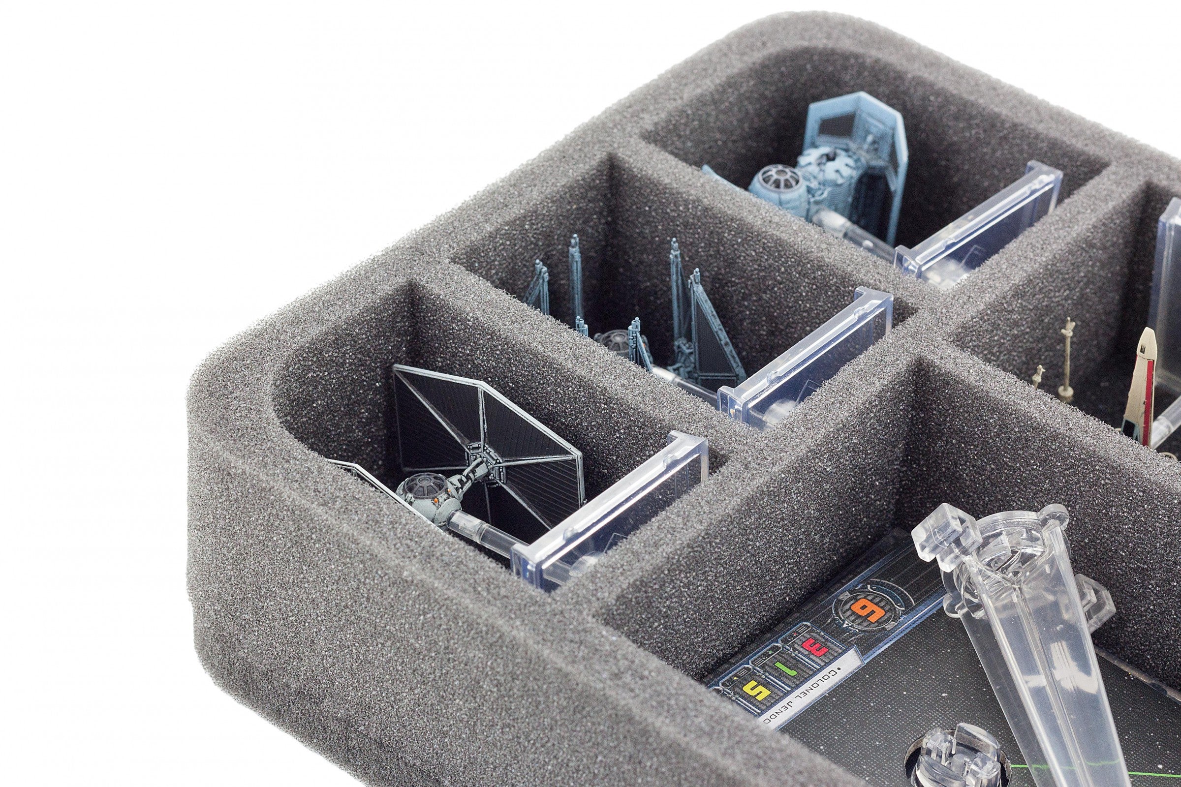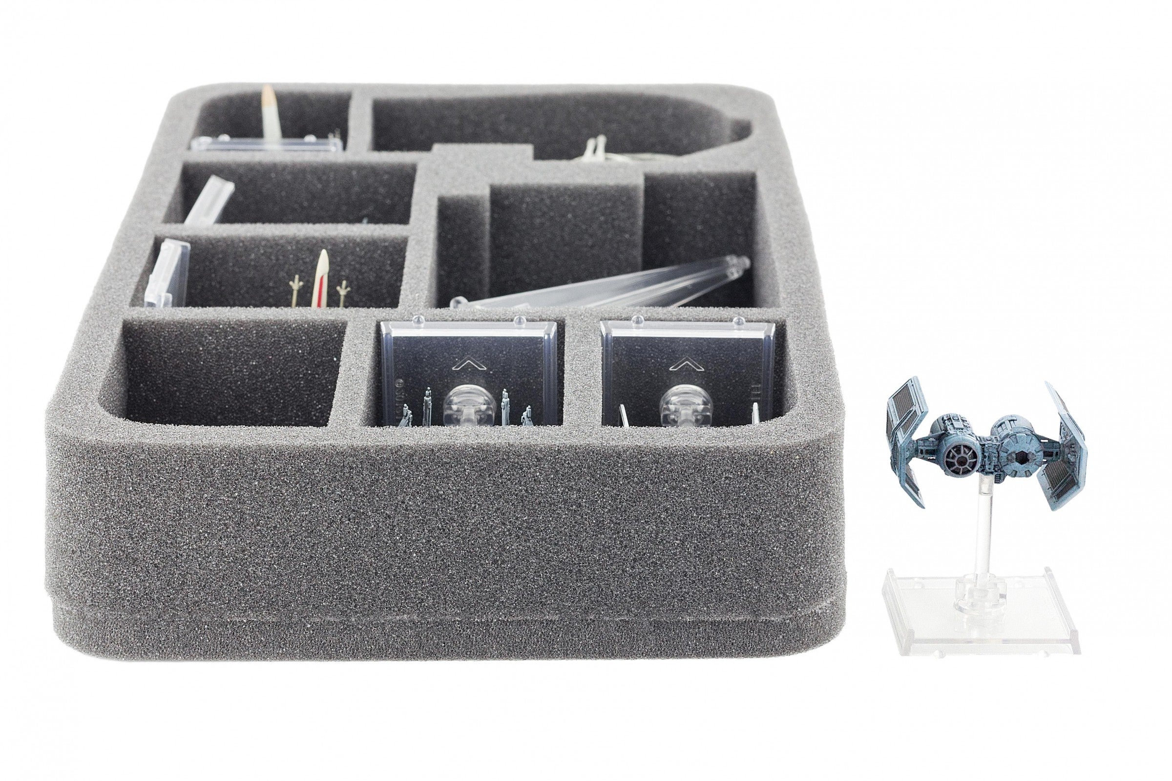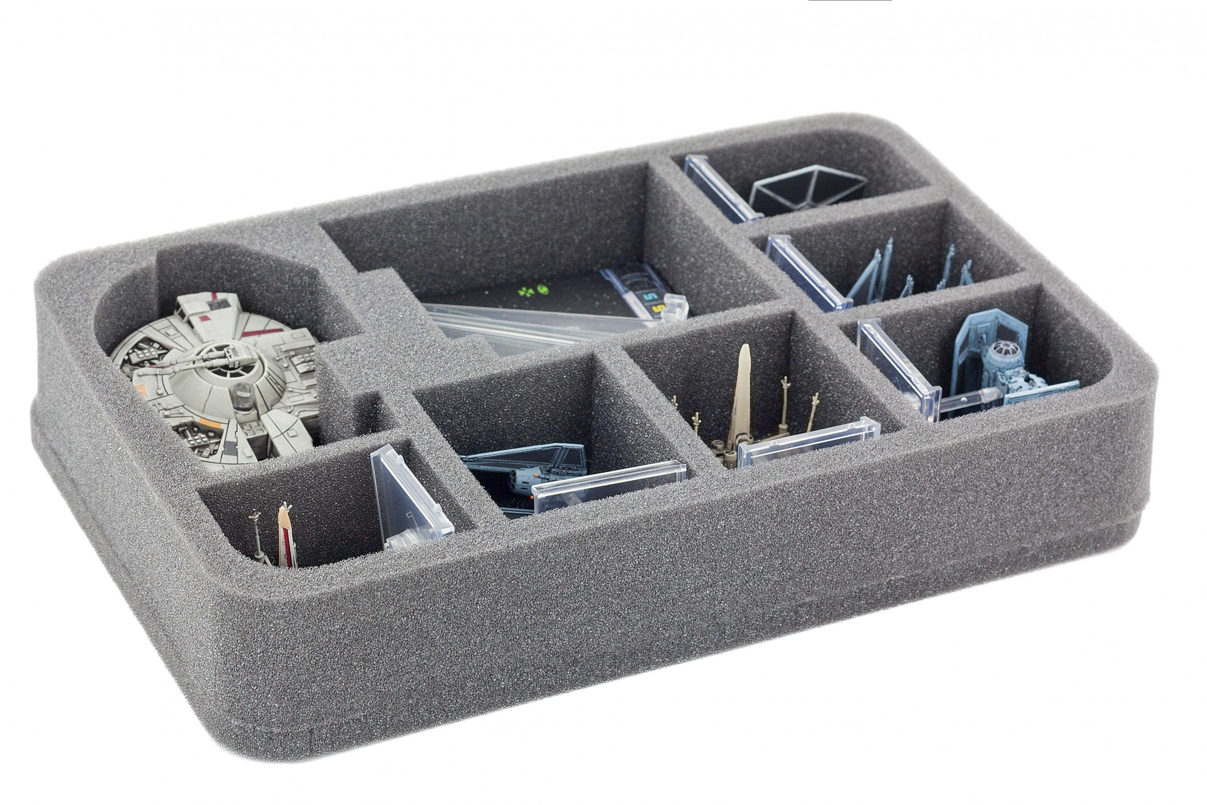 Specialmente per il vassoio in schiuma su misura per Star Wars X-WING YT-2400 Freighter. In questo contributo non solo per la YT-2400 Freighter avviene in modo sicuro, ma anche gli accessori, come basi, gettoni, stand e c'è ancora spazio per le navi spaziali X-Wing come la HWK-290, Tie Fighter e altri.